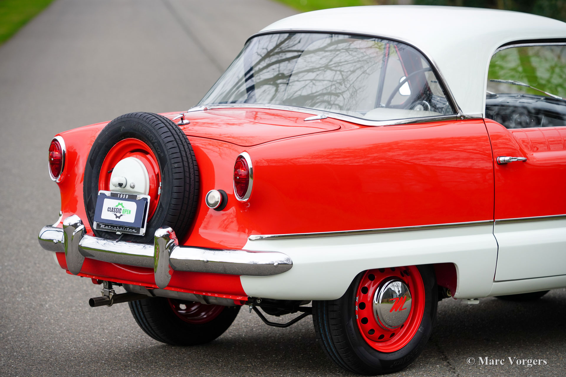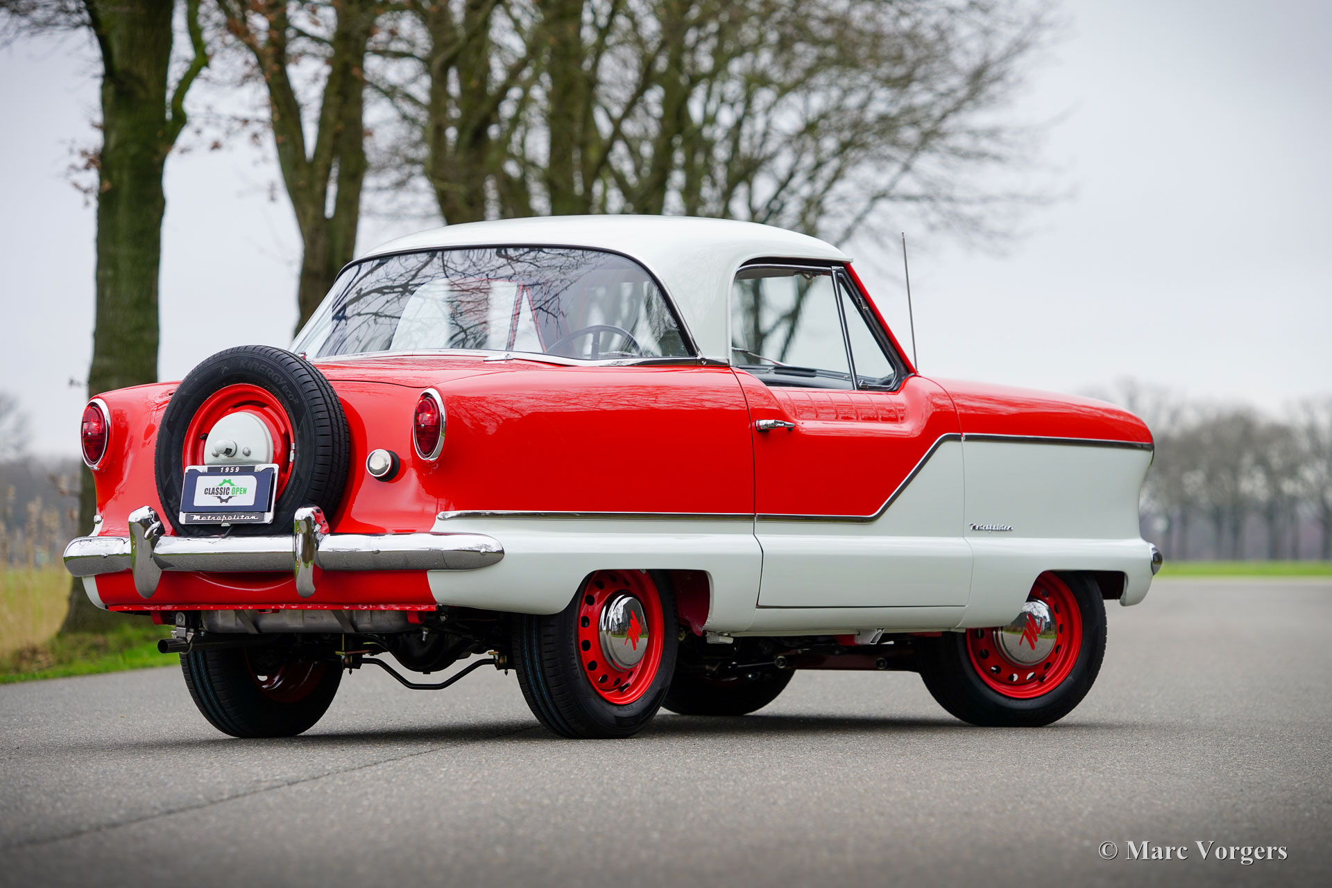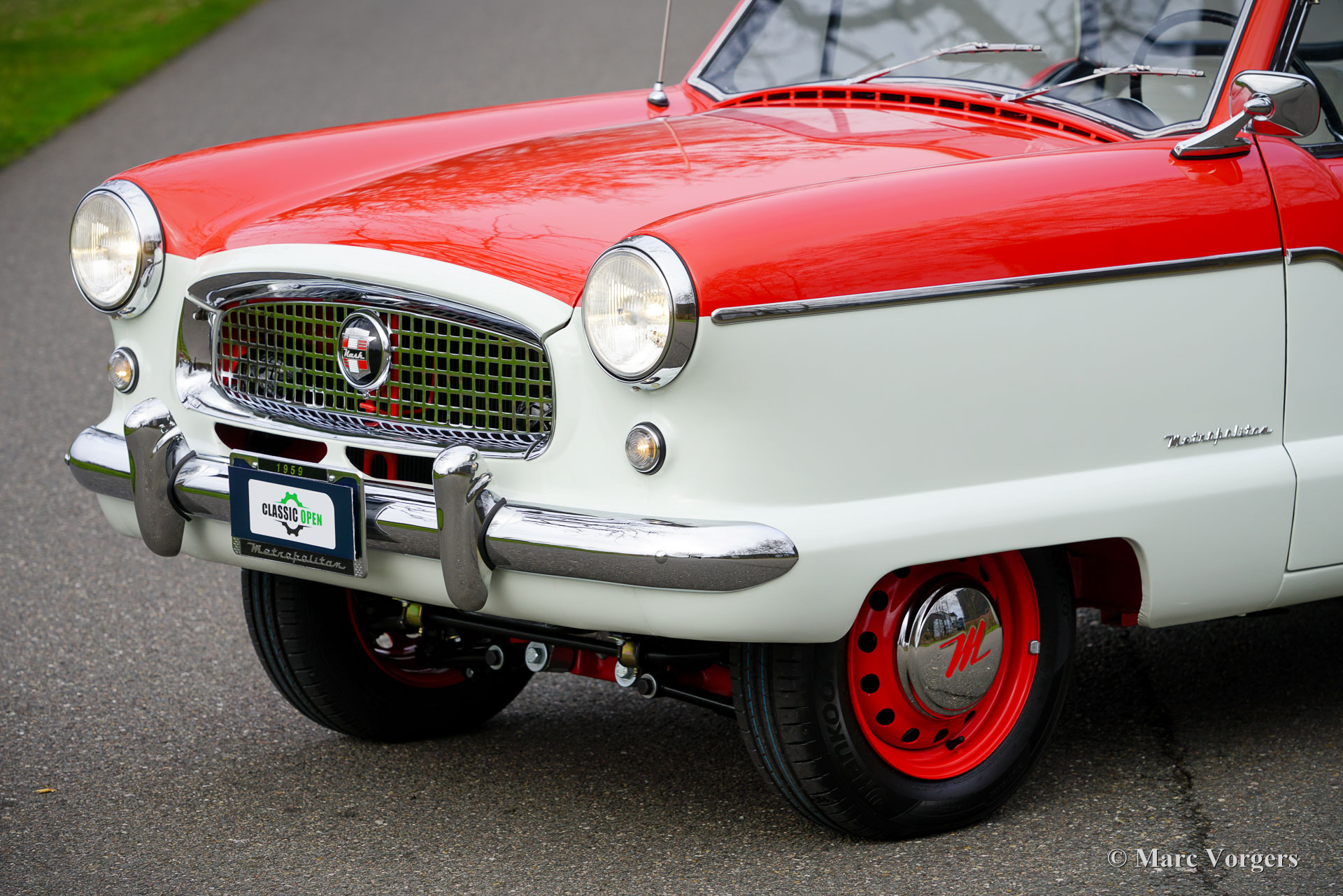 Nash Metropolitan, année 1959. Couleur rouge sur blanc crème, combiné avec un intérieur en tissu/vinyle gris/blanc garni d'un tapis noir. La Nash Metropolitan est une automobile américaine assemblée en Angleterre et commercialisée de 1953 à 1961. Environ 60 000 voitures furent produites au cours de cette période. Le Nash Metropolitan est équipé du célèbre moteur série A de 1 500 cm3 de la MG MGA. Ce magnifique exemplaire fut entièrement restauré, la voiture est dans un état TOP et la voiture roule parfaitement. Les coûts et les efforts n'ont pas été épargnés pour viser la perfection. La voiture fut modifiée et améliorée sur plusieurs points ; des freins à disque étaient installés sur les roues avant et une boîte de vitesses Ford à 5 vitesses, un allumage électronique et un alternateur étaient installés. La Nash Metropolitan montre beaucoup de caractère et les nombreux détails merveilleux ne cessent d'apparaître sur la voiture. La Nash Metropolitan est une voiture anglo-américaine qui trouve une place de choix dans les collections de voitures britanniques et américaines. C'est un SUPERBE exemple !
