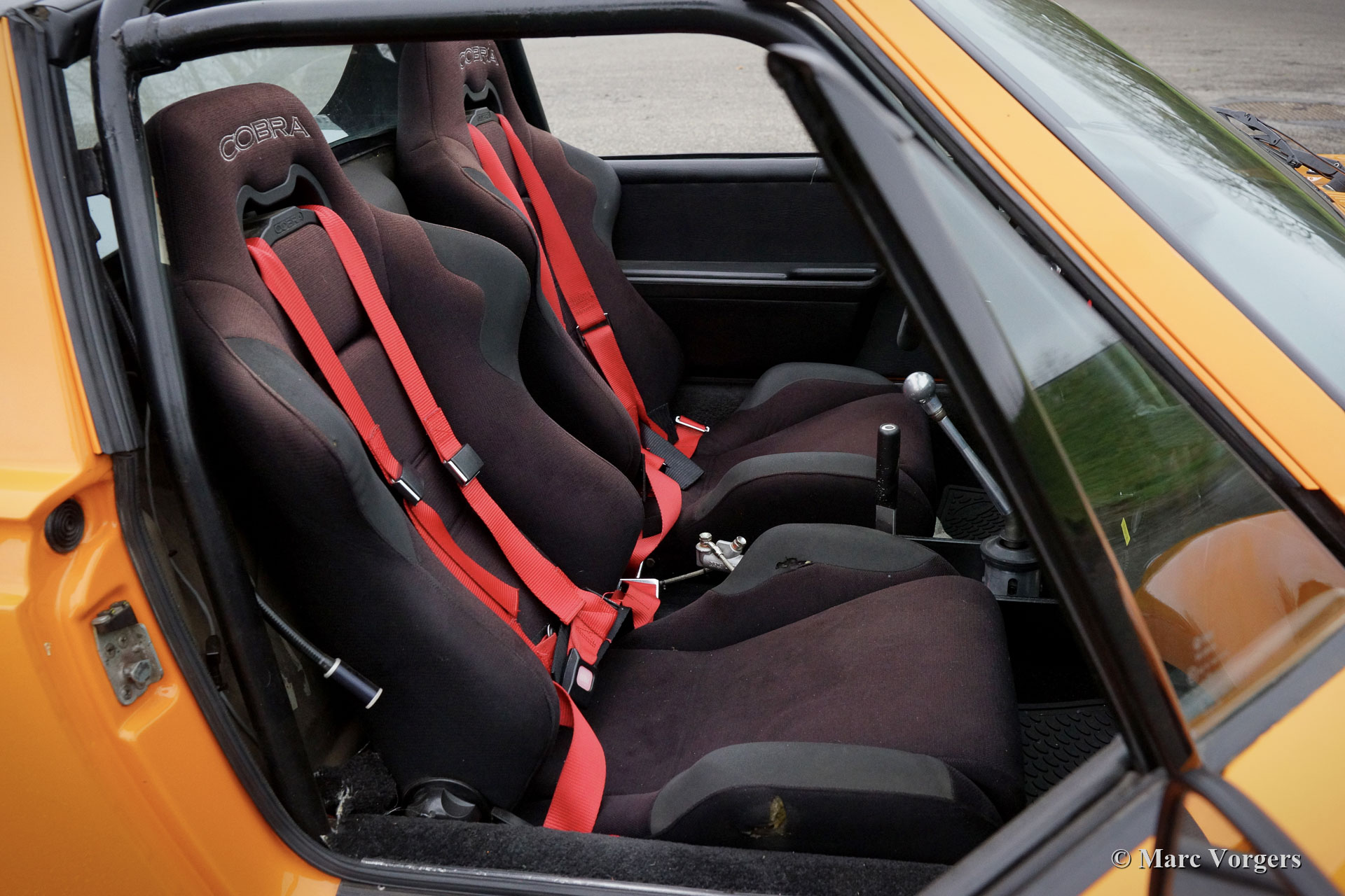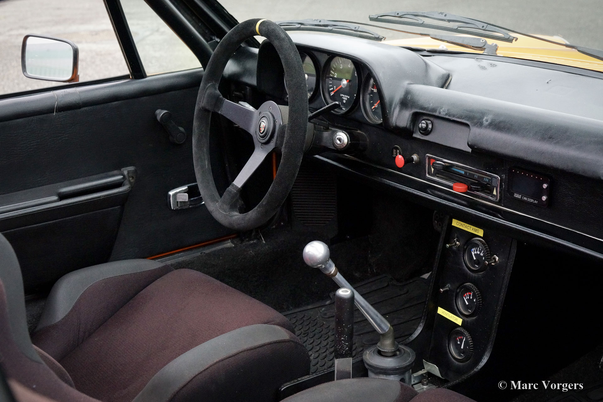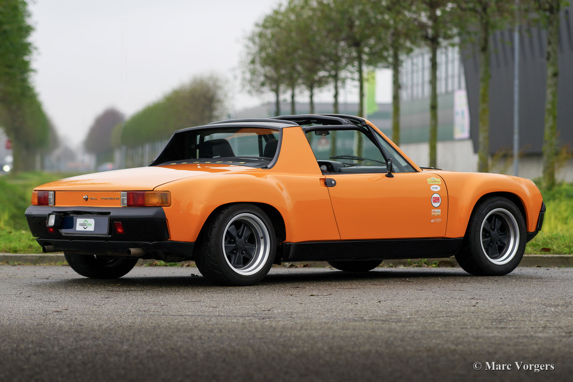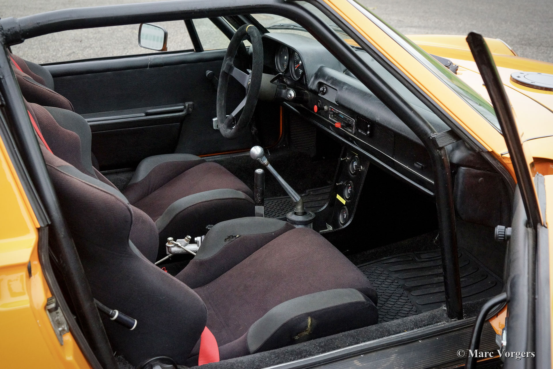Porsche 914 2.0 ‘Wide Body‘, année 1972. Couleur Orange Signal combiné avec un intérieur en tissu noir. La carrosserie de cette fantastique Porsche 914 2.0 a été modifiée dans le passé selon les spécifications « Wide Body ». Les ailes allongées étaient en tôle. Cette Porsche 914 a l'air sportive et déterminée avec sa position basse et ses magnifiques roues larges de style Fuchs chaussées de pneus 225/50-15 à l'avant et 245/40-15 à l'arrière. L'apparence n'est pas que du spectacle, le moteur boxer quatre cylindres de 2 litres et 135 ch a été réglé et équipé d'un système d'injection d'essence électrique. Pour gérer la puissance supplémentaire, la voiture était équipée d'une boîte de vitesses « dog-leg » à 5 vitesses, d'un différentiel à glissement limité, de freins à disque ventilés Willwood et d'un frein à main hydraulique. L'intérieur fut amélioré avec un arceau de sécurité, des sièges baquets sport Cobra, des harnais de sécurité à 4 points, un volant sport Sparco, un bouton de démarrage et des jauges de tableau de bord supplémentaires. La voiture est dotée d'un toit « Targa » dont le panneau peut être retiré et rangé dans le coffre arrière. Il s'agit d'une Porsche 914 « Wide Body » très sportive et désirable en bon état. Une voiture de pilotage fantastique et une voiture de sport idéale pour participer à des rallyes historiques ! La voiture est actuellement immatriculée en Belgique.