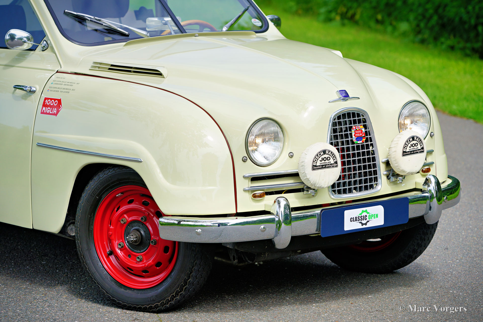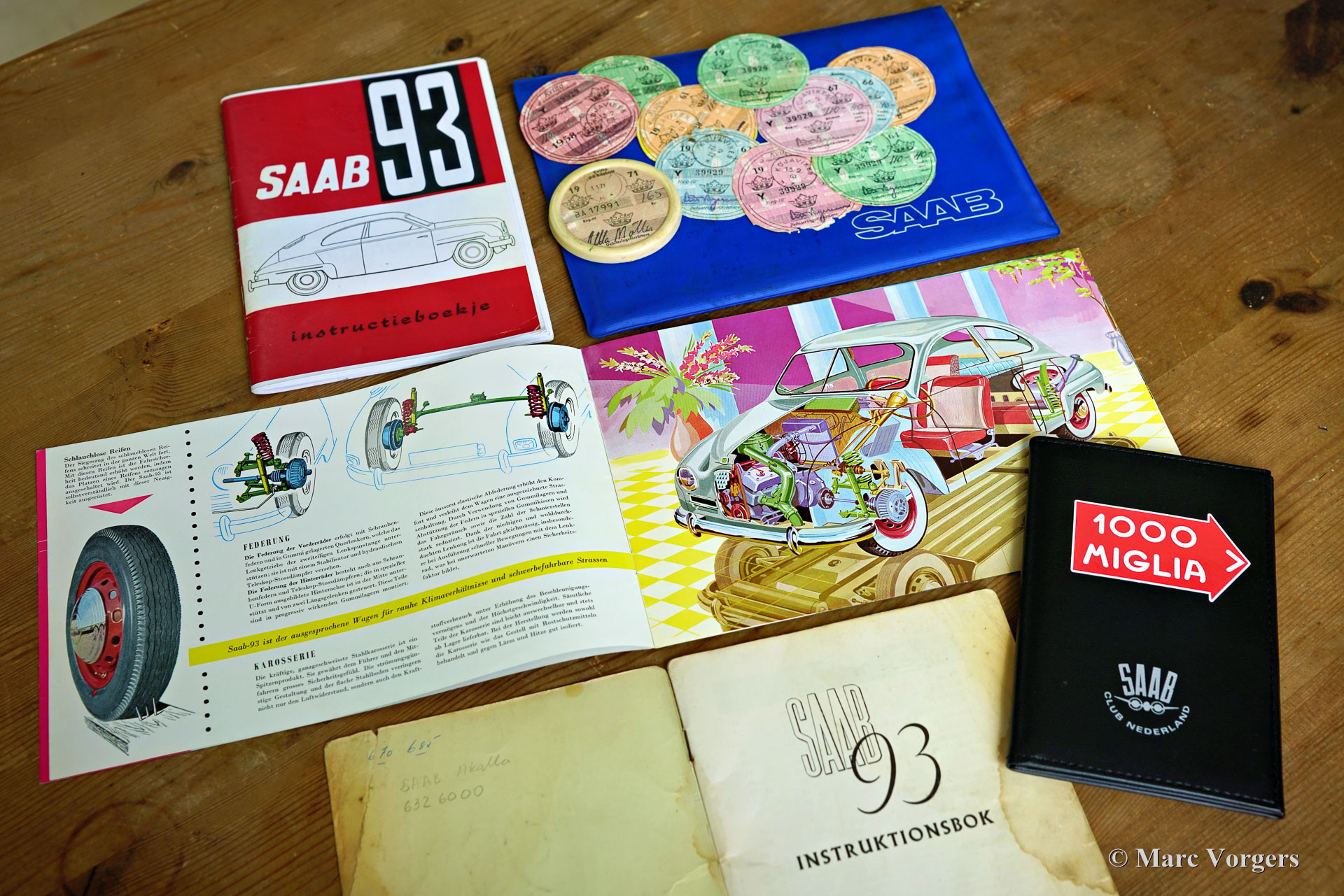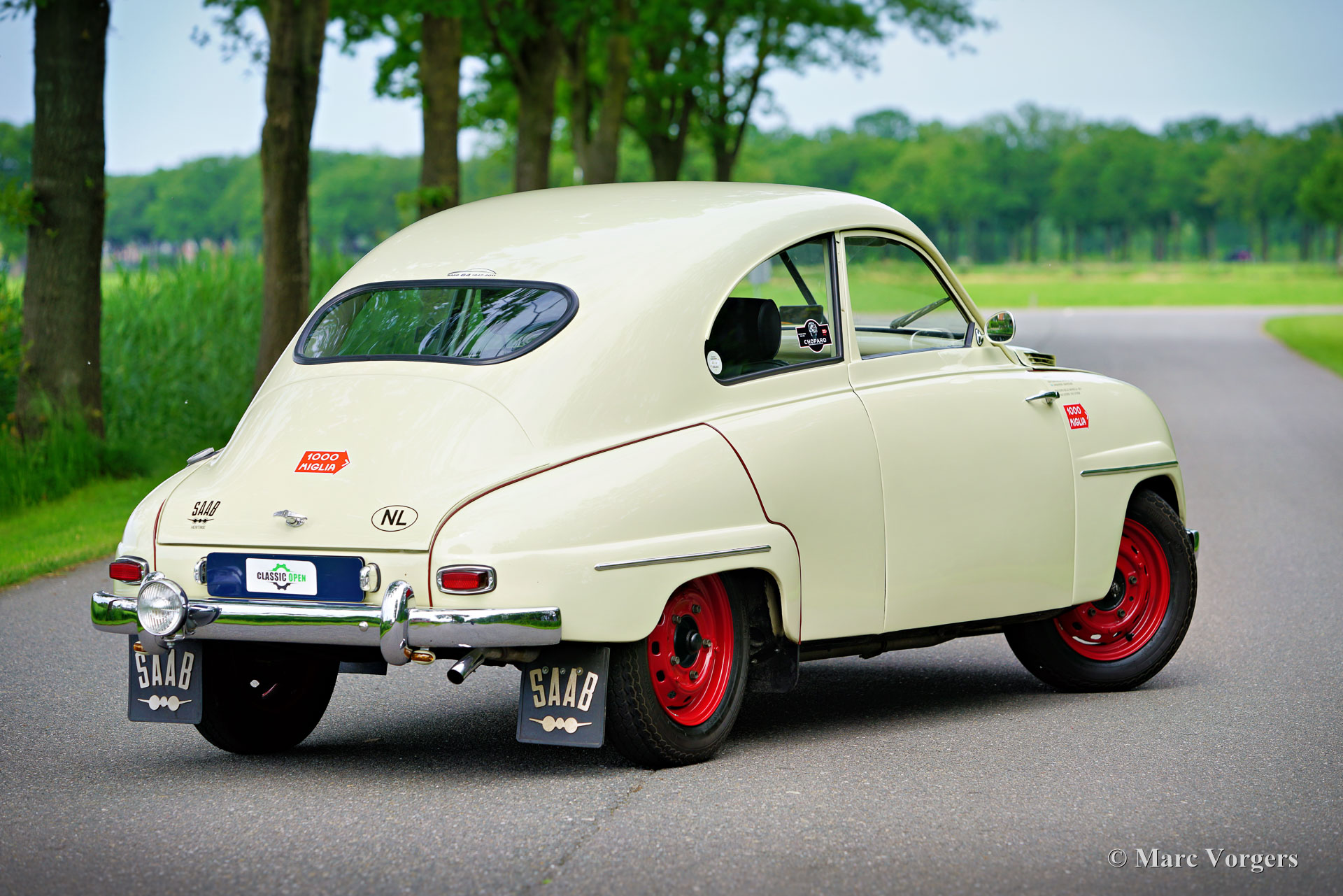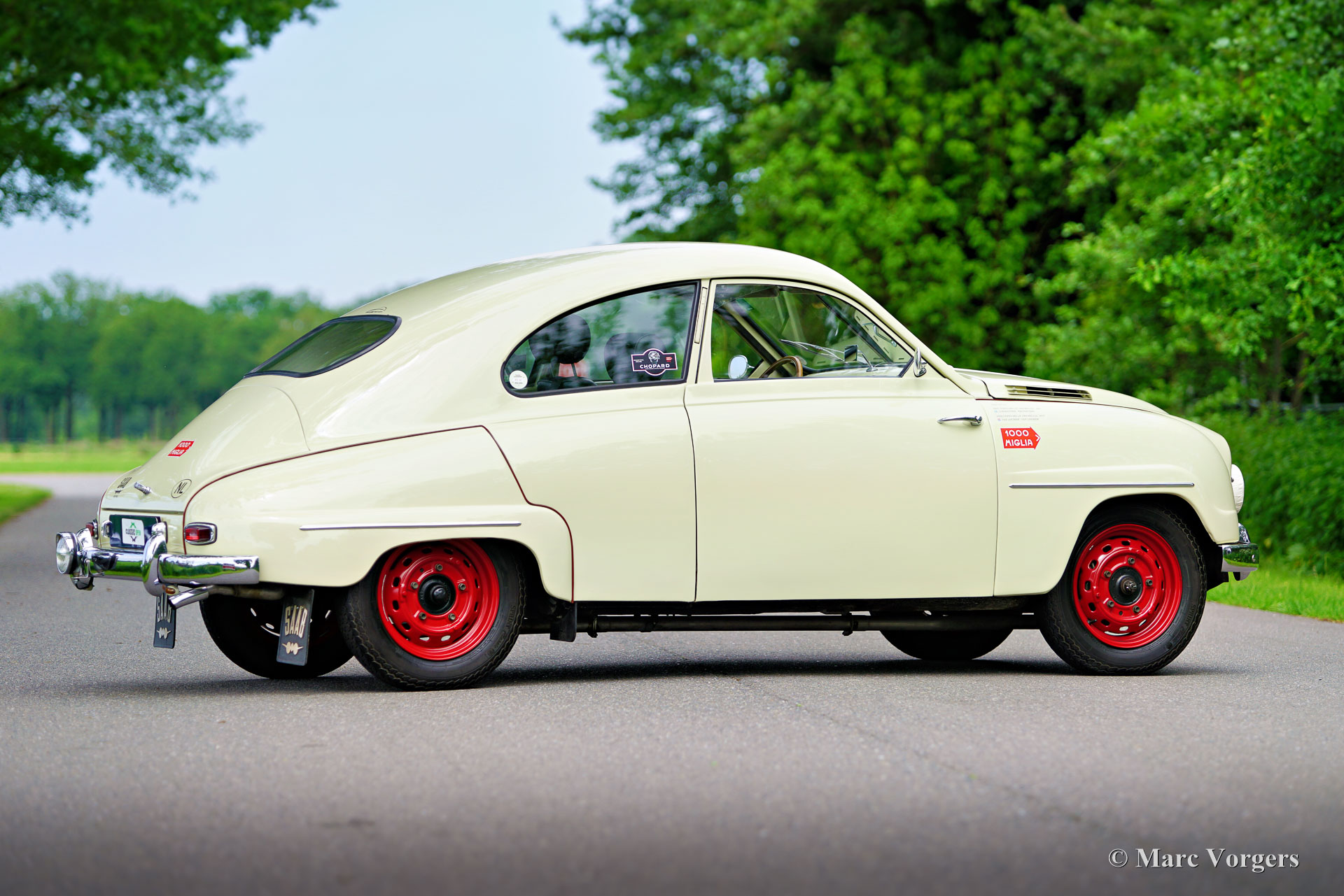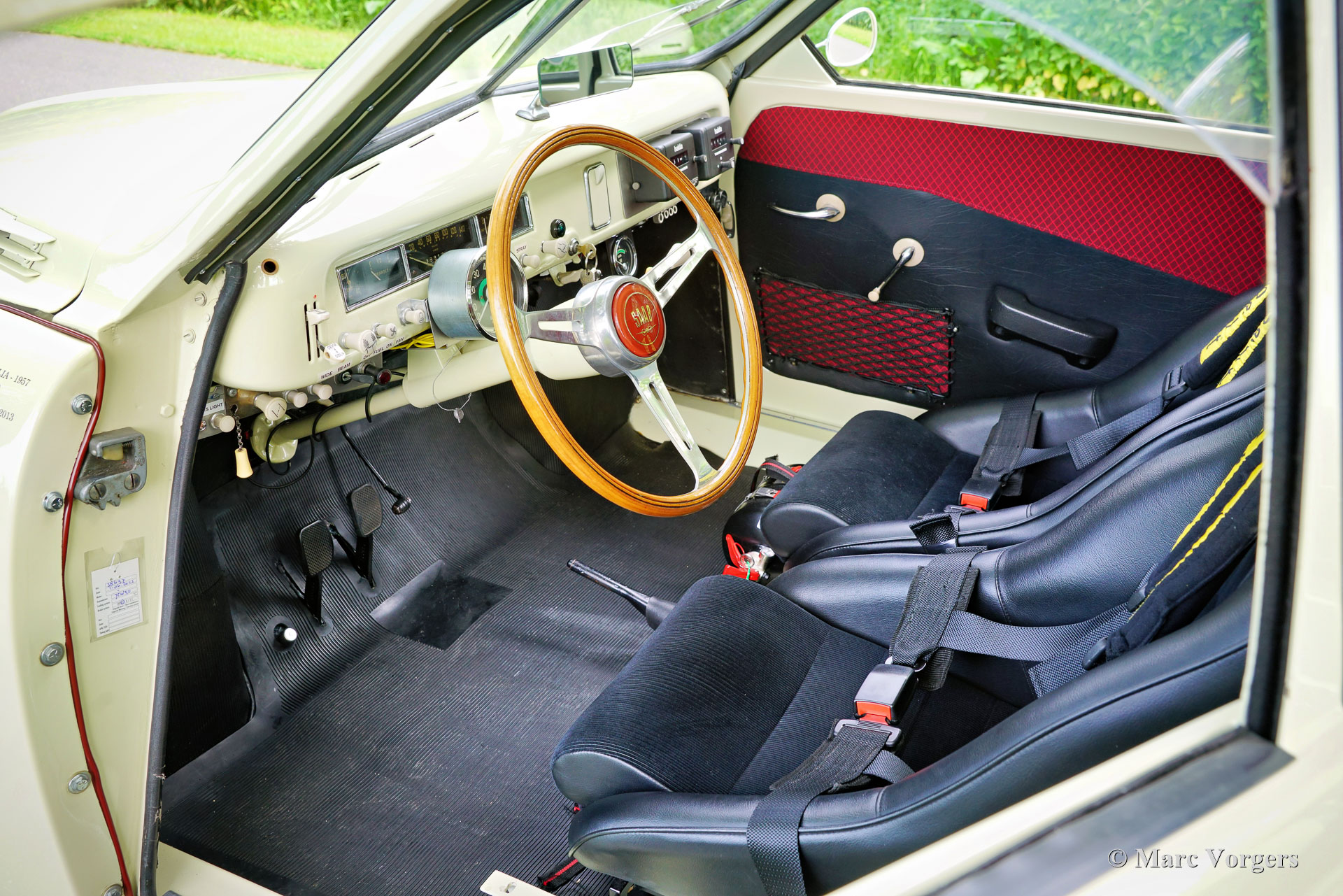 Saab 93A De Luxe, année 1957. Couleur beige combinée à un intérieur bicolore noir-rouge. Cette magnifique Saab 93A De Luxe fut vendue neuve en Suède. En 2012, la voiture fut importée aux Pays-Bas et préparée pour participer aux Mille Miglia (1000 Miglia) 2013 en Italie. Cette magnifique Saab 93 était l'une des 357 voitures historiques autorisées à participer en 2013, et la seule Saab ! Spécialement pour cet événement, la voiture était équipée de deux sièges baquets noirs avec harnais de sécurité Sparco à 4 points, les sièges (et ceintures de sécurité) d'origine sont toujours avec la voiture et peuvent facilement être remis en place. Depuis le premier jour, la voiture a connu quatre propriétaires, l'histoire est entièrement connue et documentée depuis l'origine, la voiture est livrée avec deux dossiers, un manuel d'instructions suédois et néerlandais et une brochure de vente originale. Cette Saab 93A classique est dans un excellent état et la voiture roule et sonne à merveille ! La carrosserie est tout à fait saine et présente une peinture magnifique. L'intérieur est dans un état merveilleux avec seulement les moindres signes d'utilisation antérieure. Les composants mécaniques sont en très bon état et le moteur a été révisé. La Saab 93 est équipée d'un moteur 3 cylindres en ligne à deux temps et d'une boîte de vitesses manuelle à 4 vitesses avec un levier de vitesses sur la colonne de direction. Le moteur Saab à deux temps ne freine pas sur la compression du moteur grâce à une fonction dite de « free wheel ». La Saab 93 était une voiture de rallye très réussie. De 1956 à 1960, la Saab 93 a participé avec succès à de nombreux rallyes et championnats de rallye importants. En 1957, Charlie Lohmander et Harald Kronegård ont participé à la légendaire course sur route italienne 1000 Miglia. (Puis une course épuisante et très dangereuse sur la voie publique, aujourd'hui un rallye touristique de régularité historique rapide mais sûr). Ils ont participé à la course en privé sans que l'usine Saab soit au courant de leur participation. Leur surprenante victoire de classe n’a été connue qu’après leur retour en Suède ! Grâce à cette participation aux 1000 Miglia, la Saab 93 est une automobile « éligible » aux Mille Miglia. Cette magnifique Saab 93A De Luxe présente de merveilleux détails d'origine comme le volant Saab et le grand tachymètre, et la voiture est équipée de compteurs de distance Halda Tripmaster corrects d'époque.