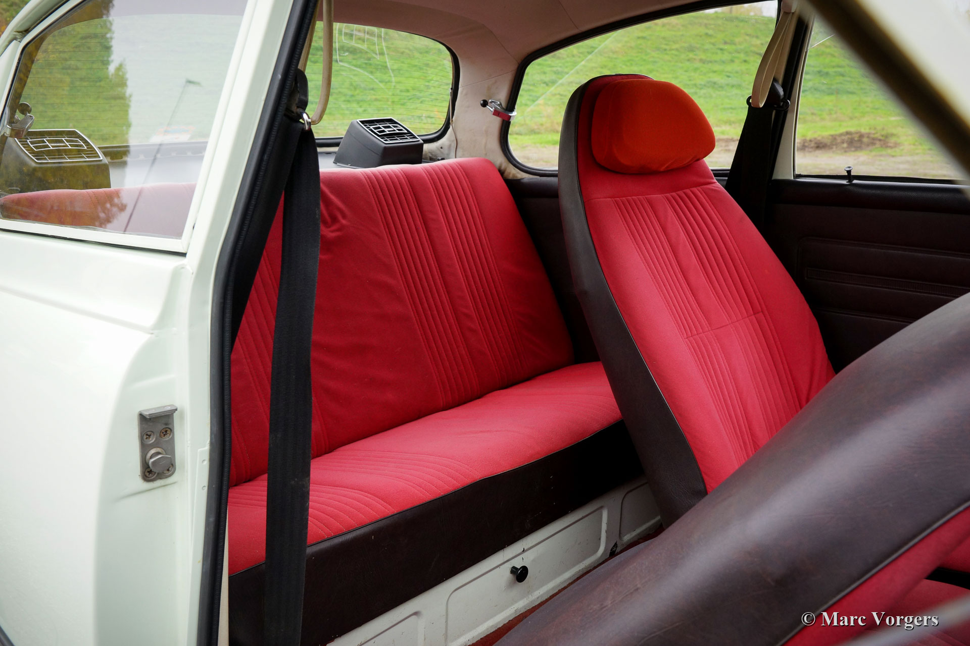Saab 96 V4 Super, année 1977. Couleur « blanc cassé » (avec une touche de vert pâle) combinée à un intérieur bicolore. Habillage des sièges en vinyle marron et tissu rouge. L'intérieur est entièrement d'origine et dans un état merveilleux pour son âge. Cette Saab 96 a été vendue neuve aux Pays-Bas, et elle est en bon état de conduite. La voiture a parcouru 189.000 kilomètres depuis neuve. La voiture fut bien entretenue au fil des ans par des propriétaires passionnés. Le moteur V4 fiable (Ford) fonctionne parfaitement et la boîte de vitesses manuelle à 4 vitesses avec levier de vitesses à colonne fonctionne très bien. Conduire une Saab 96 est très spécial, ces voitures ont beaucoup de caractère dans le style et la conduite !