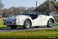 Triumph TR 3a, année 1958. Couleur blanc (Old English white) combinée à un intérieur en similicuir noir bordé de passepoil blanc et de moquette noire. Capote, housse de capote et couvre-tonneau en vinyle noir. Cette belle Triumph TR 3a fut vendue neuve aux USA. La voiture fut repeinte aux États-Unis il y a trois décennies, et elle fut exportée aux Pays-Bas en 1994. Depuis cette année, la voiture n'a connu qu'un seul propriétaire néerlandais passionné qui a apprécié la voiture jusqu'en 2022 (pendant 27 ans !). Le TR 3a a été bien entretenu au fil des ans. La voiture est dans un bon état et très original. L'intérieur est entièrement d'origine et très bon, le compartiment moteur est très propre et mécaniquement tout est à jour. Cette TR 3a est une vraie voiture de conducteur et elle montre des signes d'utilisation et d'âge, une belle patine vintage. La voiture montre tous les détails d'origine, et elle est équipée de roues à rayons chromées avec de beaux écrous de roue à oreilles. Il s'agit d'un TR 3a très désirable, abordable et fiable pour le conducteur passionné de TR !