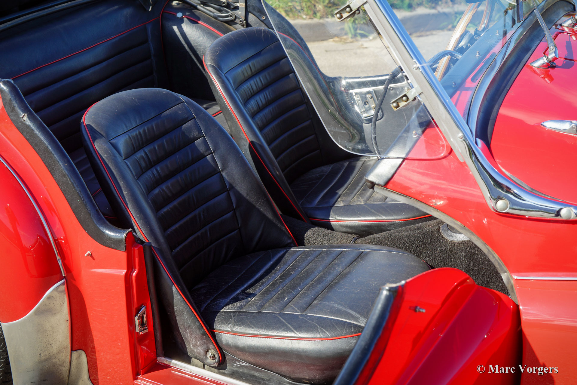 The Triumph TR 3 is a no nonsense sports car; very robust, simple and reliable, a true British sports car all over. The TR 3 was the first production car, off factory, equipped with disc brakes on the front-wheels. The engine was a Standard Vanguard based, cast-iron, long stroke, in-line four cylinder with a displacement of 1991cc. The TR 3 engine was equipped with two carburettors giving a power-output of almost 100 bhp.