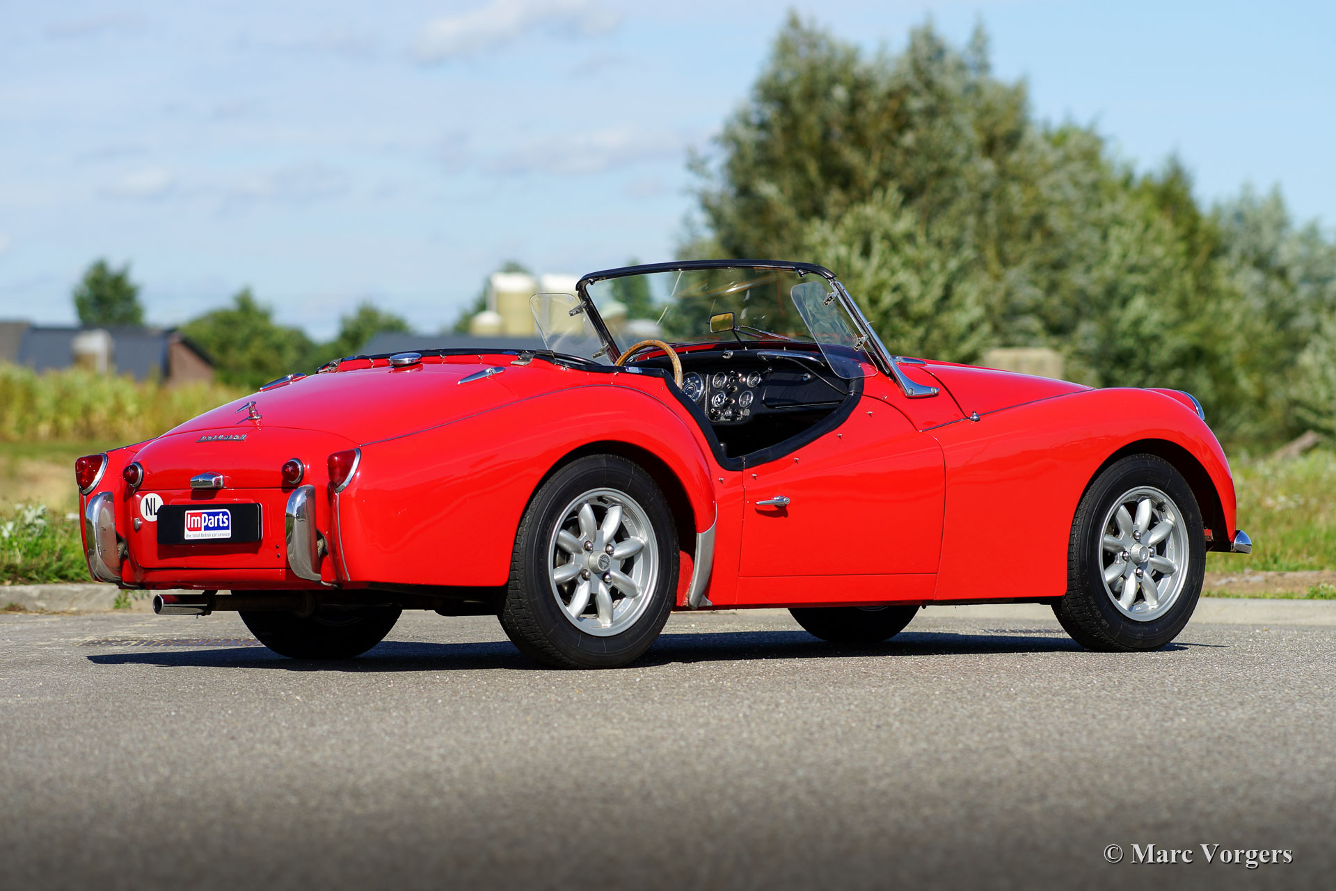 Triumph TR 3A, année 1960. Couleur rouge combinée avec un intérieur noir et un tapis noir. Capot souple et cadres d'écran latéraux noirs. Cette sportive Triumph TR 3A a été restaurée il y a 15 ans. La voiture a été conduite et appréciée à plusieurs reprises et bien entretenue. Cette TR 3A est en bon à très bon état, avec des signes d'utilisation normaux, et la voiture roule parfaitement. L'automobile est équipée d'un puissant moteur de 2,2 litres équipé de deux carburateurs Weber à double starter. Le moteur fut modifié pour fonctionner à l'essence sans plomb et la dynamo DC fut remplacée par un alternateur AC. De plus, cette TR 3A sportive est équipée de jantes en alliage de style Minilite, d'un overdrive, de freins assistés et d'un volant MotoLita. La voiture est livrée avec un toit rigide d'origine rare en blanc !