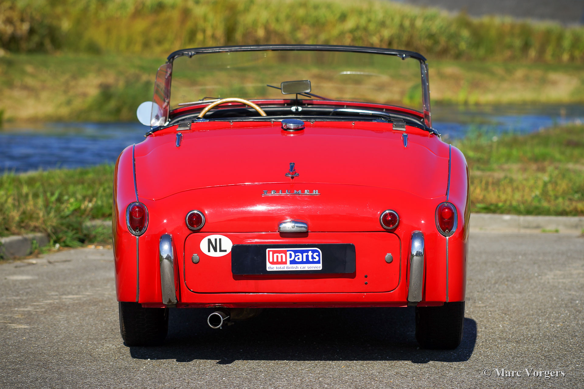 The Triumph TR 3 was uprated twice during the entire production period. In 1957 the car became a wider grille, door handles on the outside and slightly recessed headlamps and was named TR 3a then. In 1960-61 the cylinder capacity was enlarged to 2138 cc. giving a capacity of 104 bhp. and extra torque. Also the fully synchronized TR4 gearbox was incorporated. The car was then named TR 3b. The TR 3 is a pure two-person roadster, a classic generously giving you the fifties British sports car feeling, rough but honest. It comes with a simple soft-top for weather protection. Separate clip-on side screens can additionally be attached to the doors.