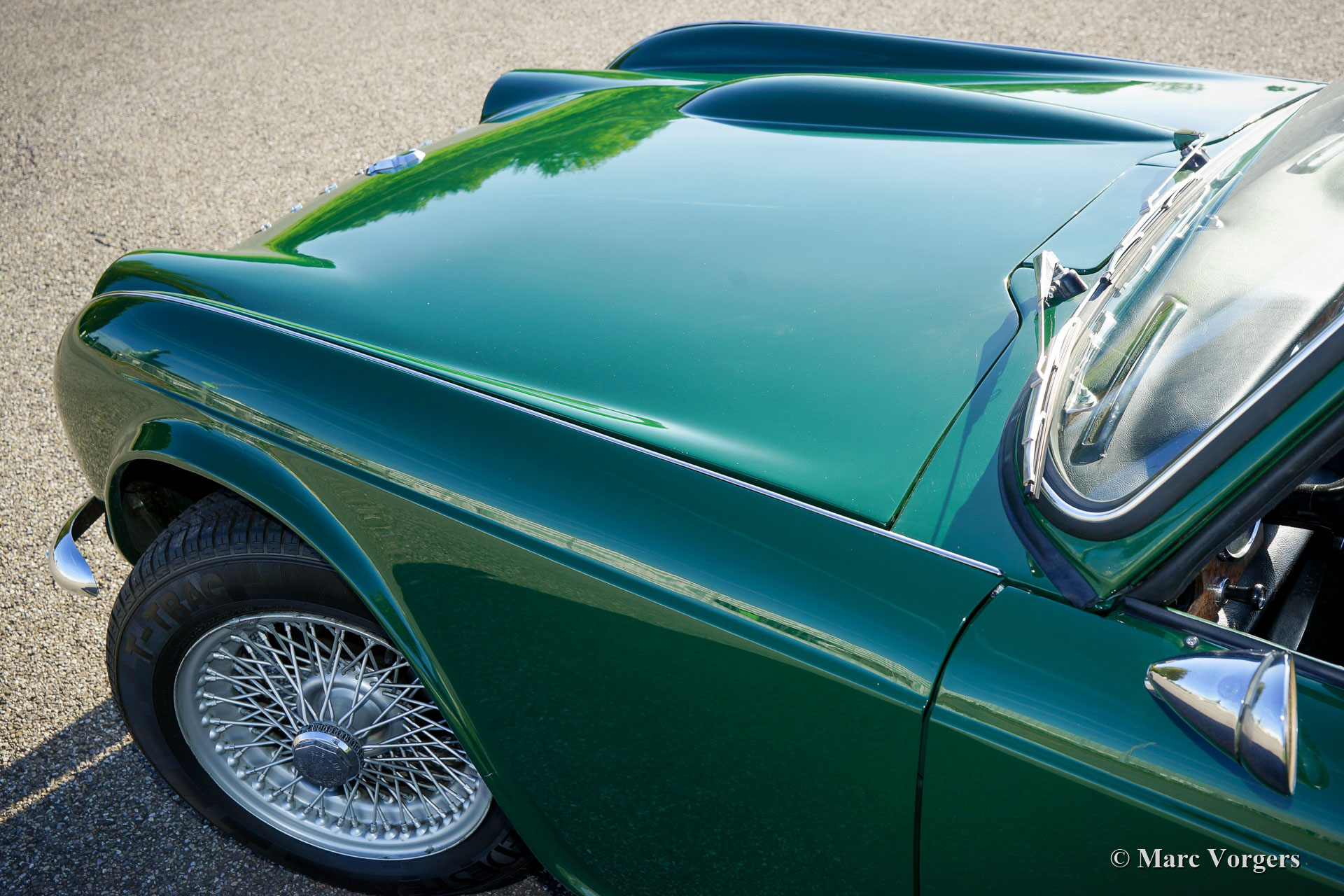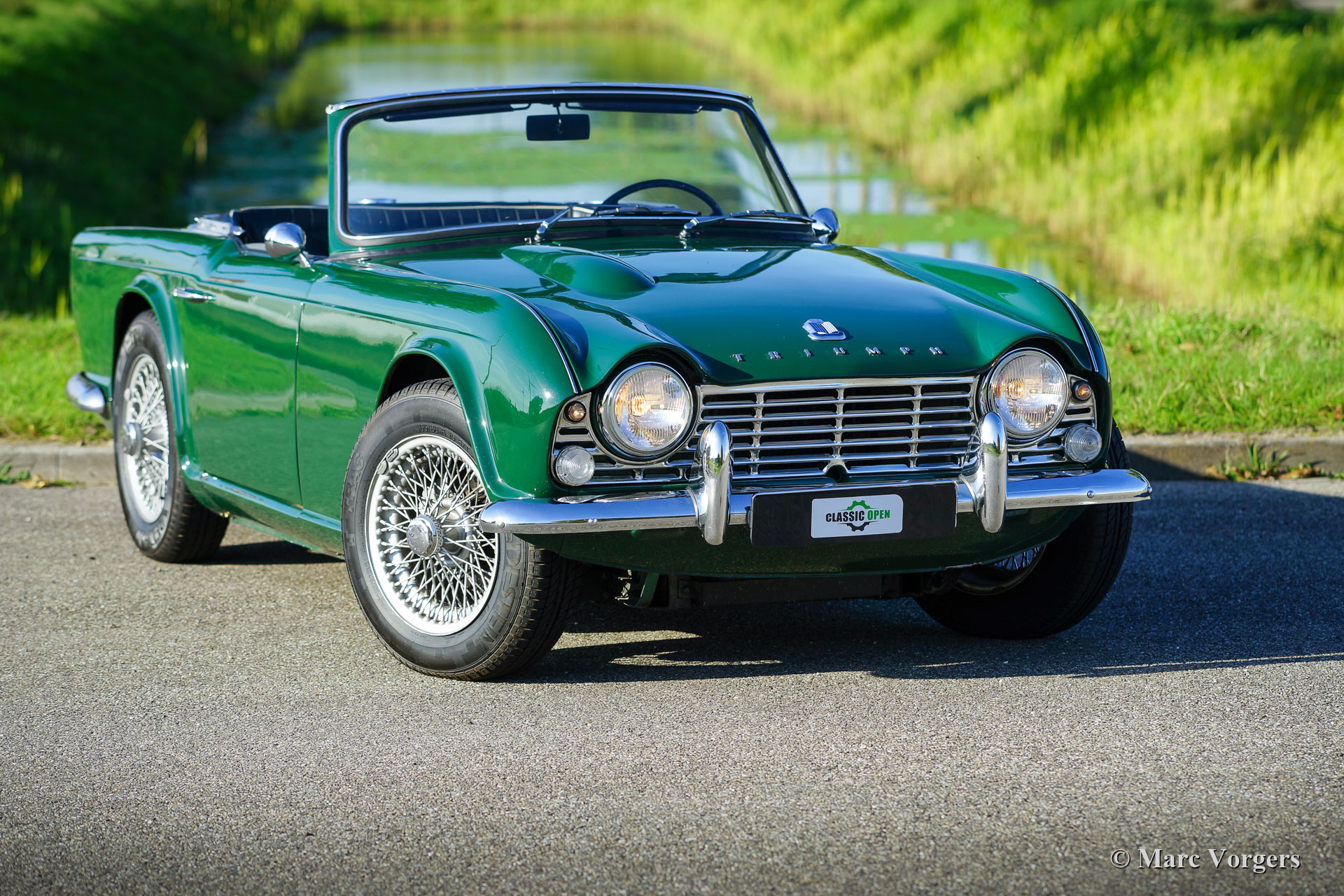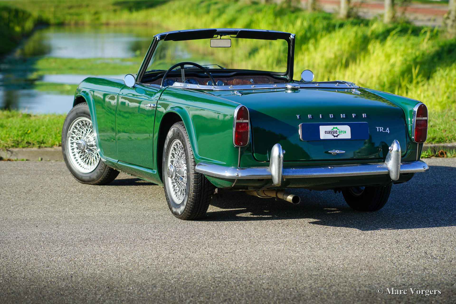 Triumph TR 4, année 1965. Couleur Triumph Racing Green combinée à un intérieur en cuir noir garni de passepoil blanc et de tapis noir. Capote noire. Cette magnifique Triumph TR 4 est en très bon état et la voiture montre tous les détails d'origine, y compris le volant et les filtres à air d'origine. Son prédécesseur, la Triumph TR 3A, était une voiture de sport britannique robuste qui a connu un grand succès dans la compétition de rallye. Au début des années 1960, le designer italien Michelotti a été chargé de concevoir une nouvelle carrosserie pour le châssis TR éprouvé en rallye et en course. Le résultat était la Triumph TR 4 élégante et raffinée qui était non seulement très belle, mais aussi beaucoup plus pratique. La TR 4 s'est avérée être une voiture de sport encore meilleure avec une maniabilité et une direction améliorée. Cette magnifique TR 4 est équipée de roues à rayons peintes en argent et d'un tableau de bord en bois. Une fantastique voiture de pilote en très bon état.