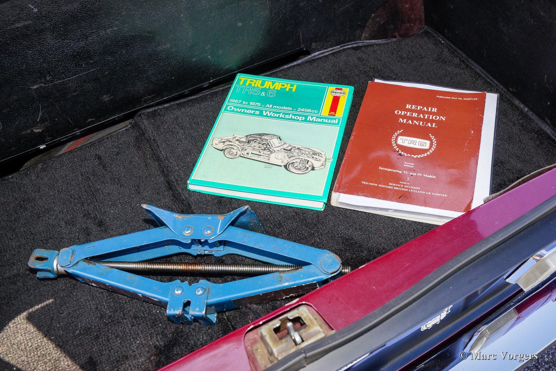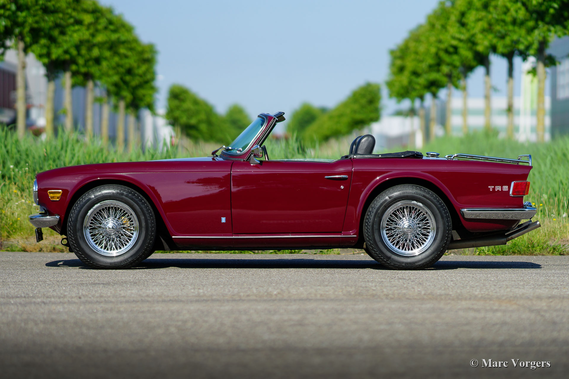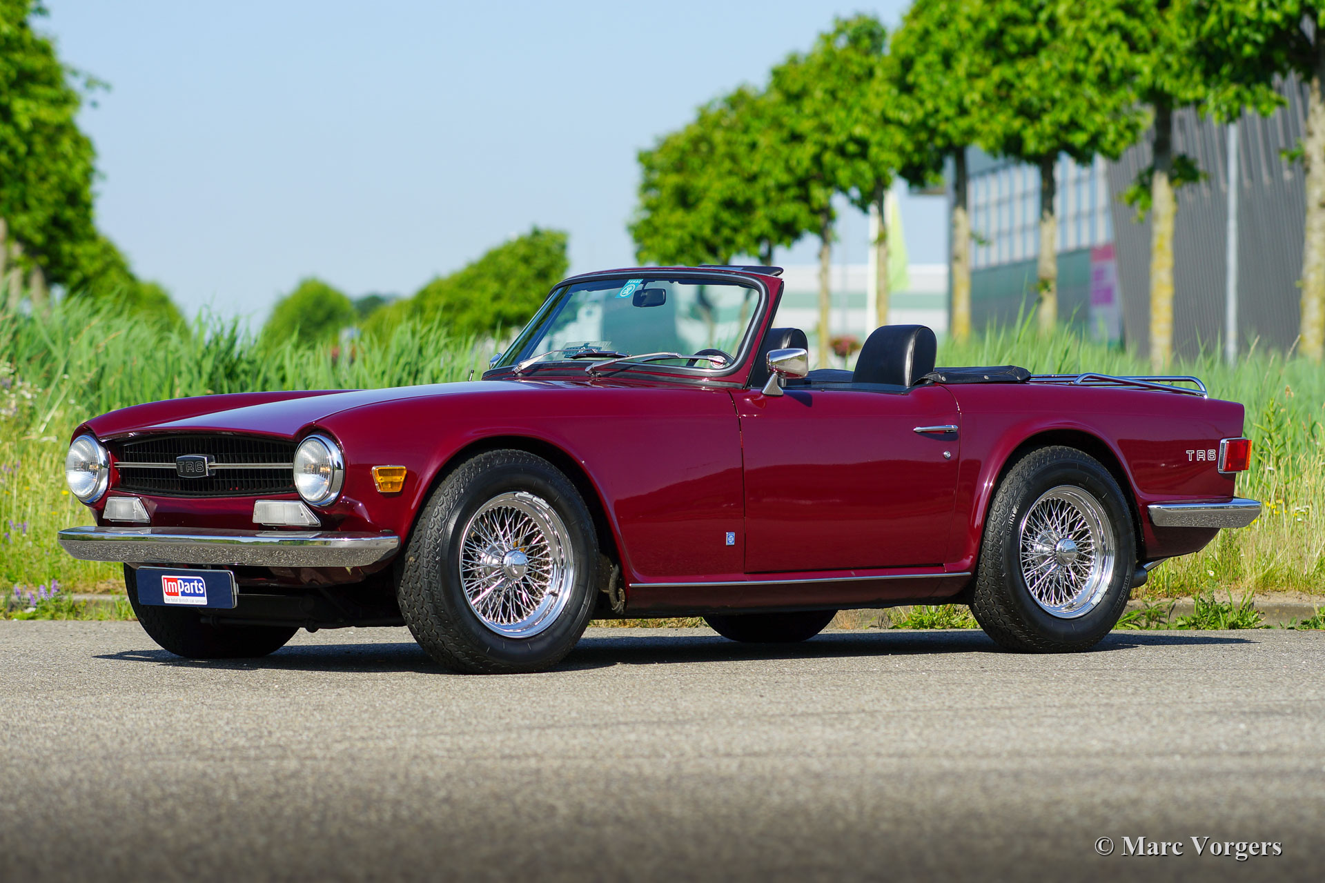 Triumph TR 6, année 1969. Couleur rouge « damson » combinée avec un intérieur en similicuir noir, un tapis noir, une capote en vinyle noir et un couvercle de capot noir. Cette formidable Triumph TR 6 fut construite en 1968, ce fut donc l'un des premiers modèles de carburateurs exportés aux États-Unis. Cette magnifique automobile fut importée aux Pays-Bas en 1998. Cette TR 6 fut largement restaurée dans le passé, la voiture est toujours en excellent état et elle roule et pilote exceptionnellement bien ! La voiture roule, freine et passe les vitesses parfaitement et tout semble très bien construit, restauré et entretenu. Cette Triumph TR 6 masculine et sportive est dotée de larges roues à rayons chromés, d'un overdrive, d'un couvercle de soupapes en aluminium, S.U. carburateurs, filtres à air sport K&N et système d'échappement en acier inoxydable. La suspension a été améliorée avec des bagues en polyuréthane pour une conduite plus solide et une meilleure direction. L'intérieur fut amélioré avec un tableau de bord en noyer et un pommeau de levier de vitesses assorti. Sous le capot, vous trouverez une boîte de rangement en bois polyvalente pour les petites pièces de rechange. Le délicieux moteur six cylindres de 2,5 litres est puissant, et la note d'échappement est addictive ! Ceci est un exemple hautement souhaitable en excellent état !