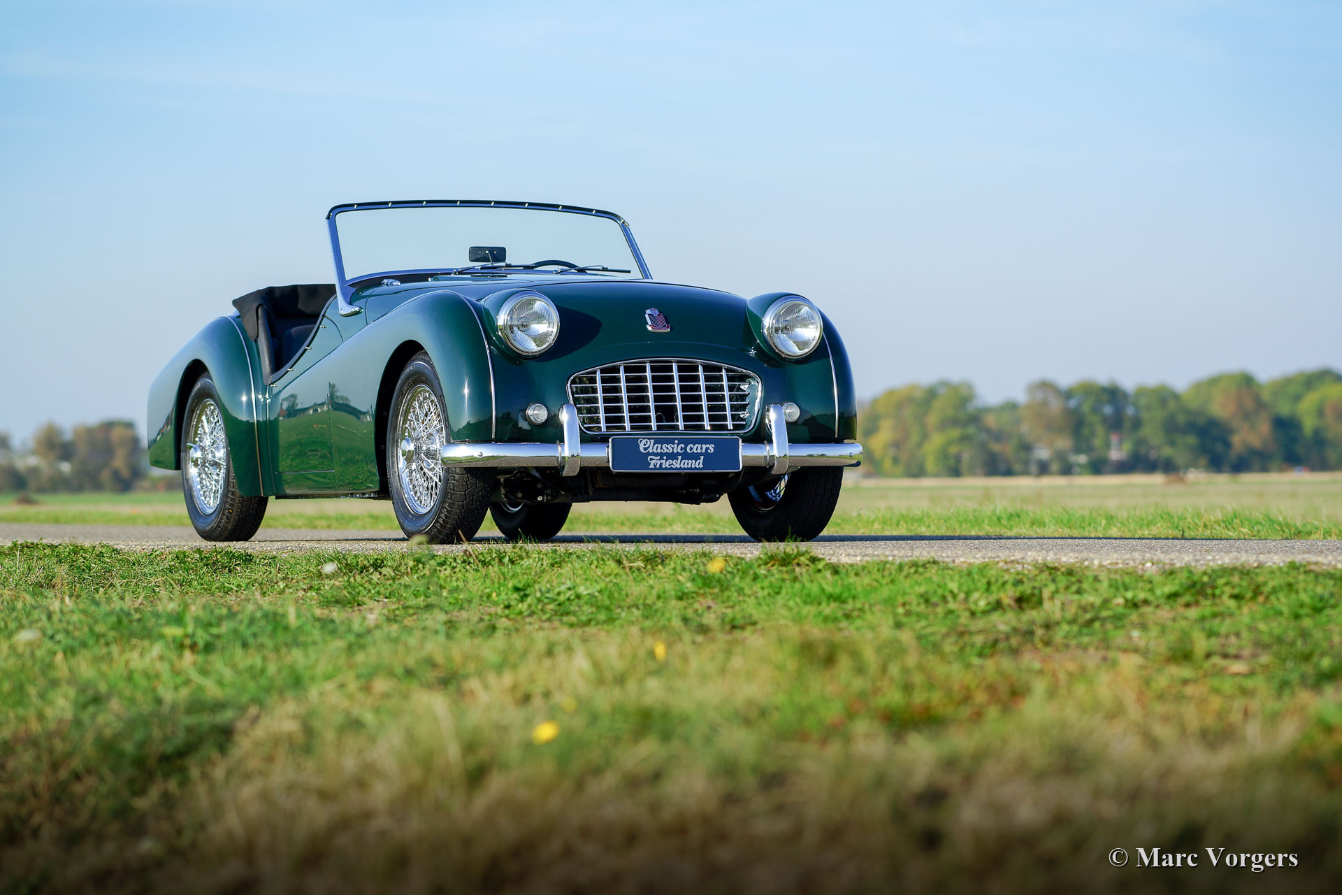 Triumph TR3, année 1955. Couleur British Racing Green combinée avec un intérieur en cuir noir et un tapis noir. Capote et couvercle de la hotte en mohair noir et écrans latéraux avec cadres noires. Cette magnifique et assez rare Triumph TR3 avec « small-mouth-grille » fut restaurée détaillée et «body-off» aux Pays-Bas. La voiture est en superbe état : Concours ! Au cours du restauration, le châssis était sablé et laqué noir. La carrosserie montre un superbe ajustement des panneaux et l'intérieur a été recouvert à la perfection. Mécaniquement, la voiture fut révisée détaillée. Le moteur, la boîte de vitesses, la surmultipliée (overdrive), les carburateurs et la suspension furent révisés. Le faisceau de câbles et les pièces chromée furent renouvelés. La voiture est équipée avec des roues à rayons chromées et un échappement en acier inoxydable. Cette Triumph TR3 très fine est livrée avec un jeu d’outils et le manuel de conduite et entretien original. Un exemple de GRANDE CLASSE !