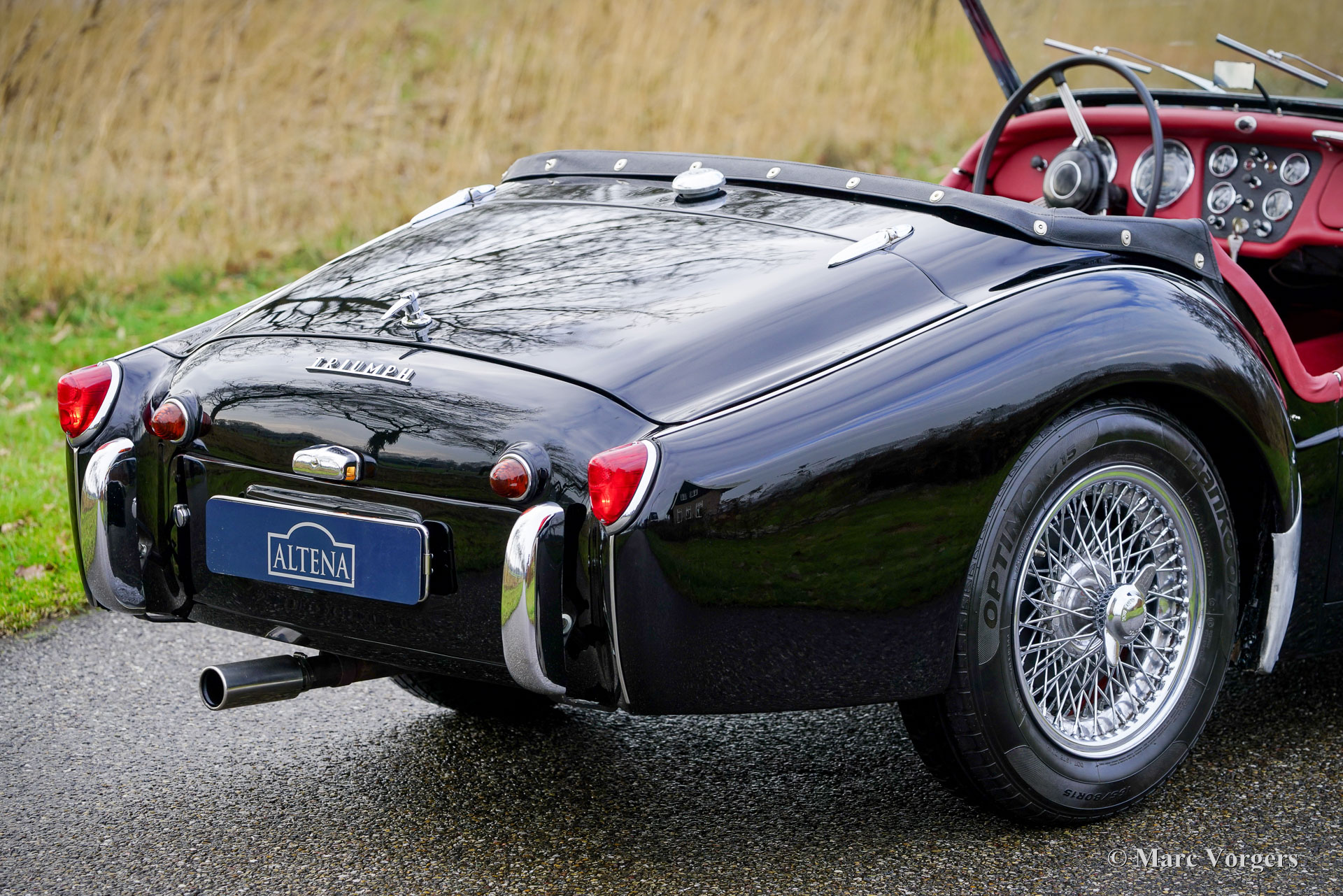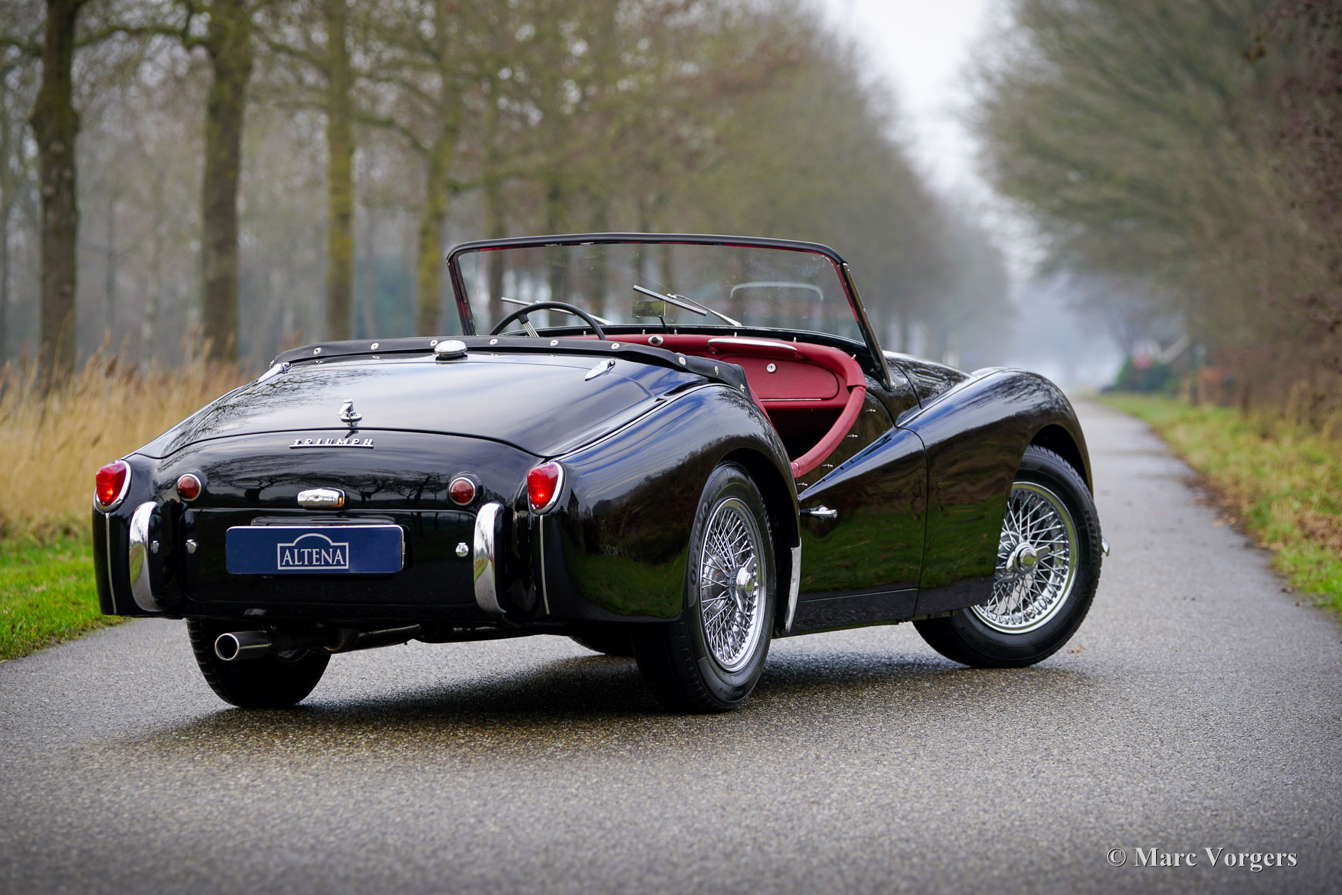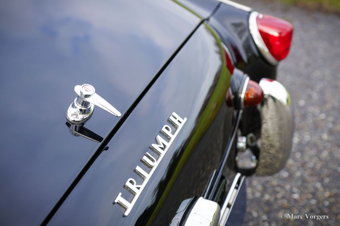 Triumph TR3A, année 1959. Numéro de châssis TS40961L, numéro de moteur TS41374E, numéro de carrosserie 1015991. Numéros concordants « matching numbers », attestés par un document Heritage. Carrosserie noire, intérieur cuir rouge avec moquette rouge. Capote et couvre-capote en vinyle noir. Cette magnifique Triumph TR3A a été vendue neuve aux États-Unis et importée aux Pays-Bas. Entre 2024 et 2025, elle a bénéficié d'une restauration sympathique : peinture neuve impeccable et intérieur rénové. La carrosserie présente un ajustement des panneaux parfait et cette combinaison de couleurs lui confère une allure superbe ! La mécanique est d'origine et a été régulièrement entretenue ; cette Triumph TR3A est en excellent état. Elle conserve tous ses détails d'origine et est équipée de roues à rayons chromées, d'un pommeau de levier de vitesses chromé et d'une poignée de frein à main chromée. La Triumph TR3(A) est une sportive classique qui a connu un grand succès dans les rallyes et les compétitions automobiles des années 1950 et du début des années 1960. Sur route, c'est une voiture très agréable à conduire, offrant une expérience de conduite à ciel ouvert fantastique !