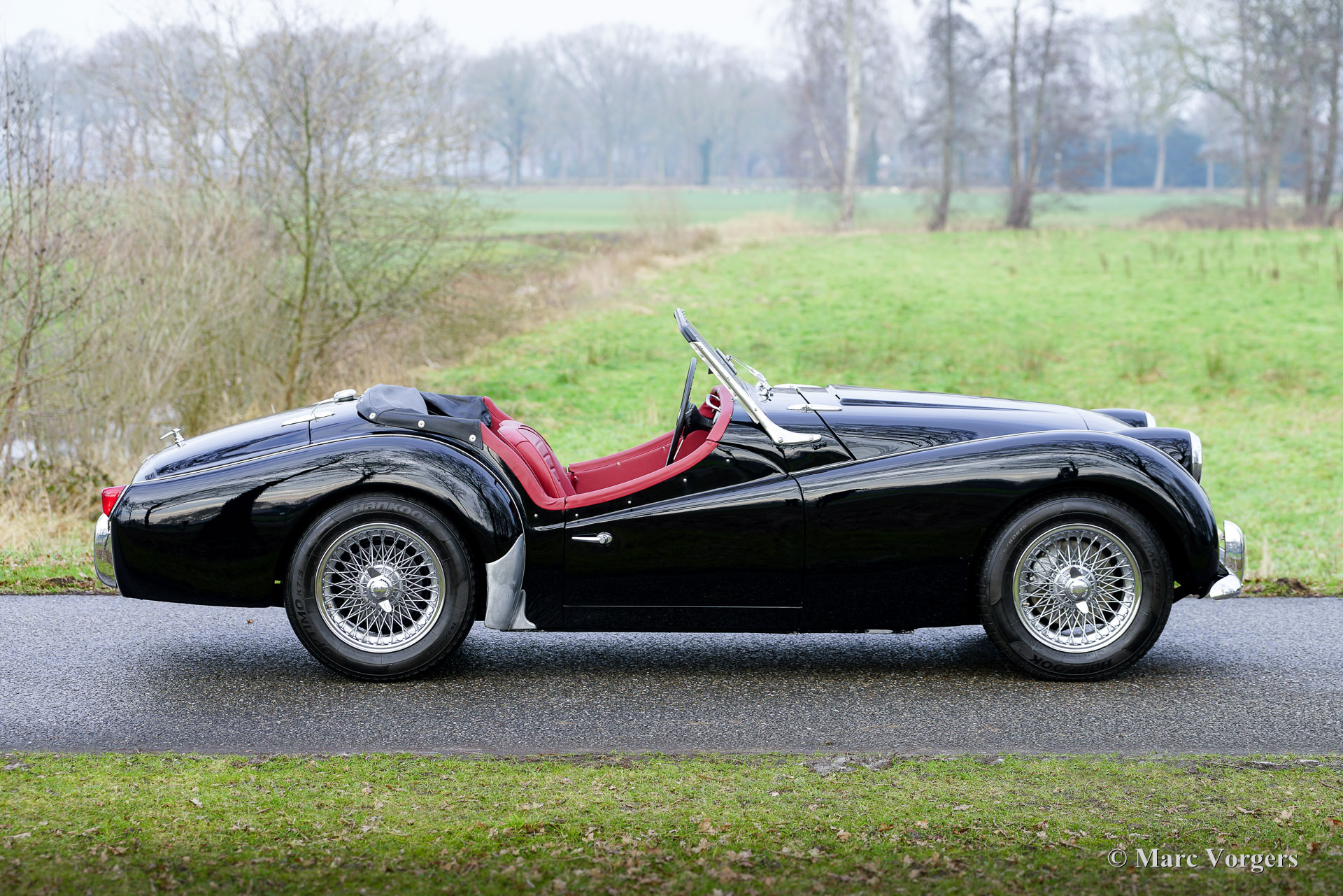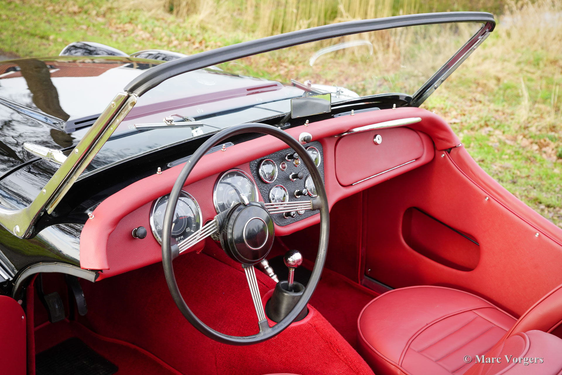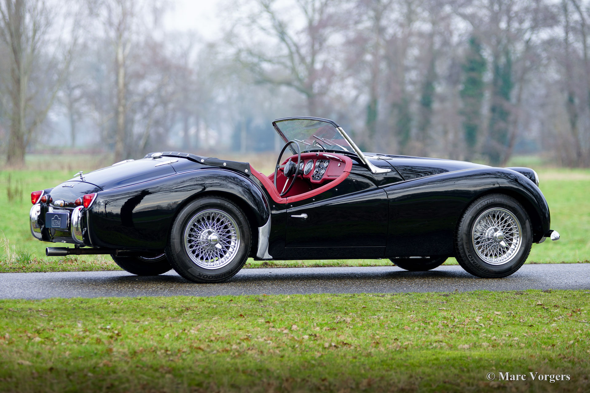 Triumph TR3A, année 1959. Numéro de châssis TS40961L, numéro de moteur TS41374E, numéro de carrosserie 1015991. Numéros concordants « matching numbers », attestés par un document Heritage. Carrosserie noire, intérieur cuir rouge avec moquette rouge. Capote et couvre-capote en vinyle noir. Cette magnifique Triumph TR3A a été vendue neuve aux États-Unis et importée aux Pays-Bas. Entre 2024 et 2025, elle a bénéficié d'une restauration sympathique : peinture neuve impeccable et intérieur rénové. La carrosserie présente un ajustement des panneaux parfait et cette combinaison de couleurs lui confère une allure superbe ! La mécanique est d'origine et a été régulièrement entretenue ; cette Triumph TR3A est en excellent état. Elle conserve tous ses détails d'origine et est équipée de roues à rayons chromées, d'un pommeau de levier de vitesses chromé et d'une poignée de frein à main chromée. La Triumph TR3(A) est une sportive classique qui a connu un grand succès dans les rallyes et les compétitions automobiles des années 1950 et du début des années 1960. Sur route, c'est une voiture très agréable à conduire, offrant une expérience de conduite à ciel ouvert fantastique !