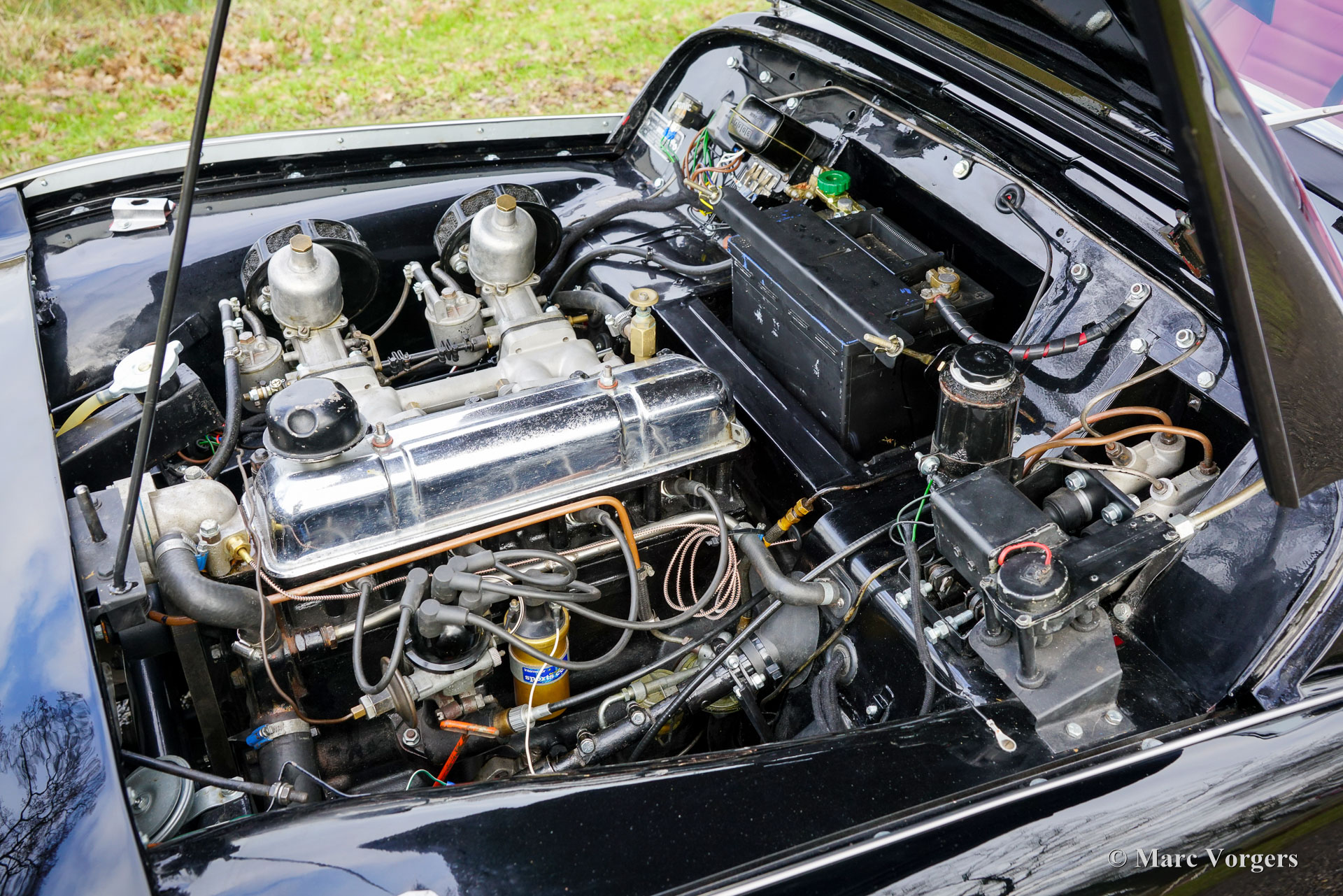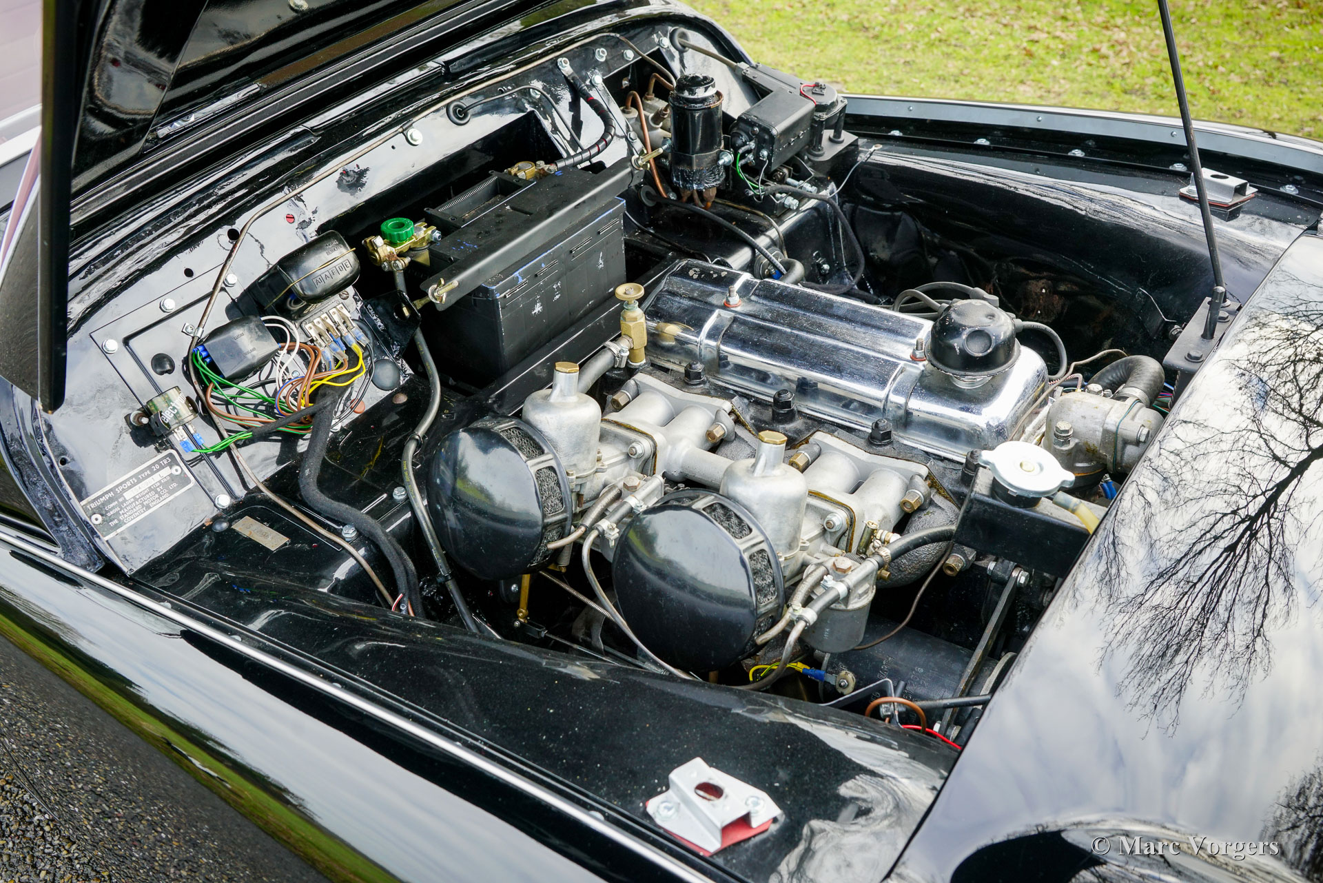 The Triumph TR 3 is a no nonsense sports car; very robust, simple and reliable, a true British sports car all over. The TR 3 was the first production car, off factory, equipped with disc brakes on the front-wheels. The engine was a Standard Vanguard based, cast-iron, long stroke, in-line four cylinder with a displacement of 1991cc. The TR 3 engine was equipped with two carburettors giving a power-output of almost 100 bhp.