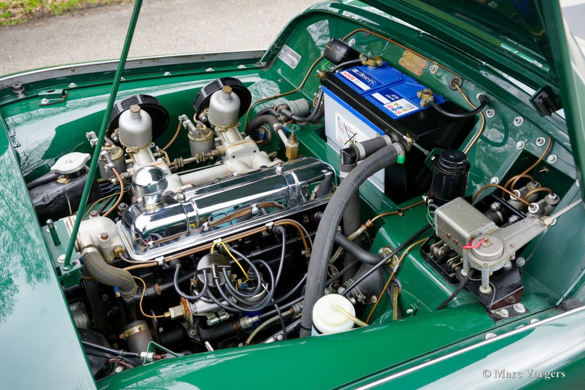 The Triumph TR 3 is a no nonsense sports car; very robust, simple and reliable, a true British sports car all over. The TR 3 was the first production car, off factory, equipped with disc brakes on the front-wheels. The engine was a Standard Vanguard based, cast-iron, long stroke, in-line four cylinder with a displacement of 1991cc. The TR 3 engine was equipped with two carburettors giving a power-output of almost 100 bhp.