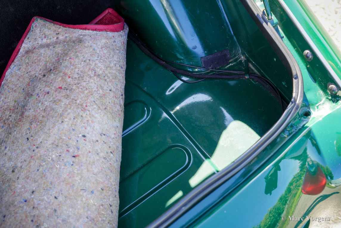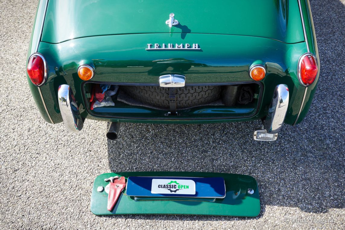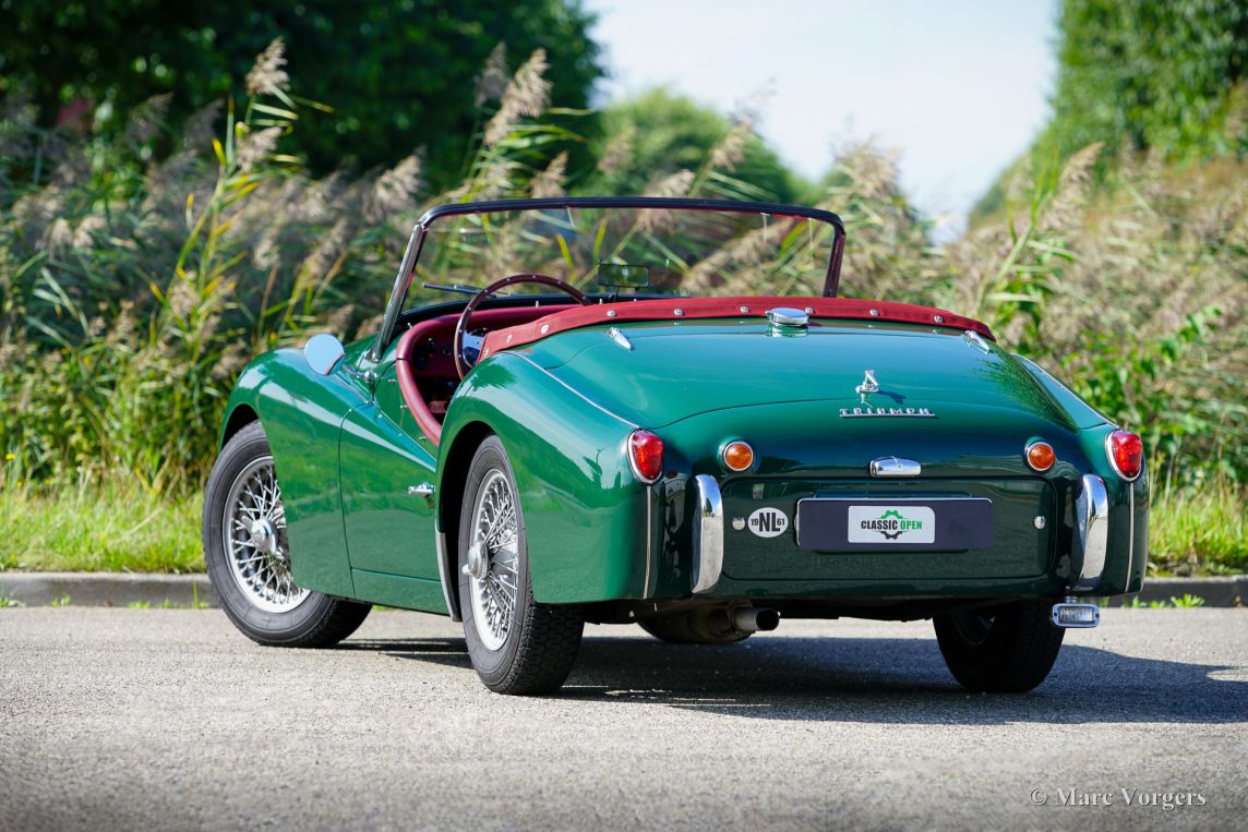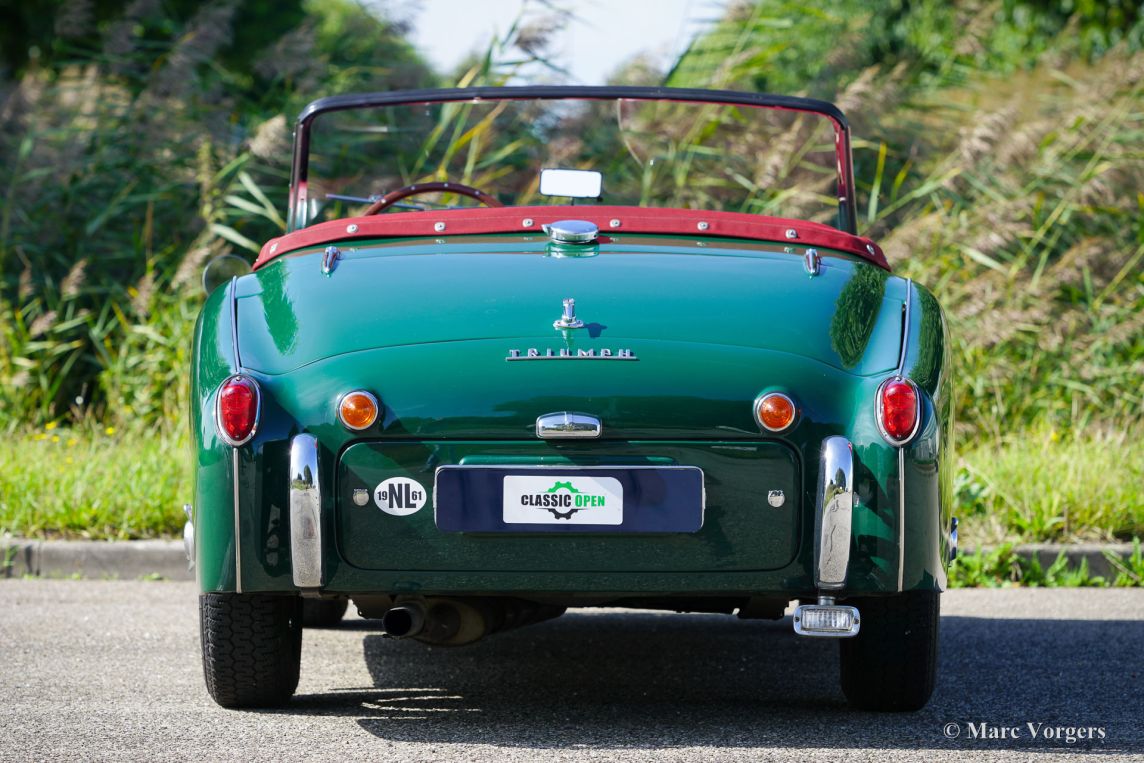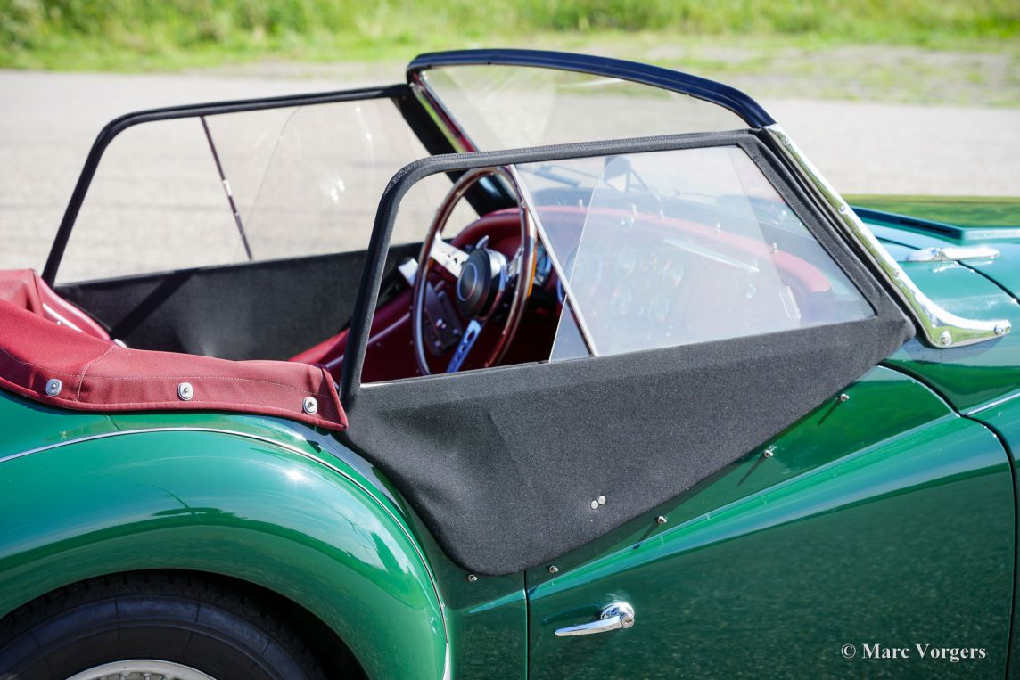 The Triumph TR 3 was uprated twice during the entire production period. In 1957 the car became a wider grille, door handles on the outside and slightly recessed headlamps and was named TR 3a then. In 1960-61 the cylinder capacity was enlarged to 2138 cc. giving a capacity of 104 bhp. and extra torque. Also the fully synchronized TR4 gearbox was incorporated. The car was then named TR 3b. The TR 3 is a pure two-person roadster, a classic generously giving you the fifties British sports car feeling, rough but honest. It comes with a simple soft-top for weather protection. Separate clip-on side screens can additionally be attached to the doors.