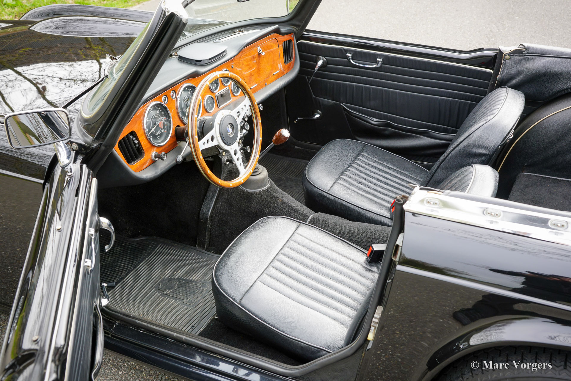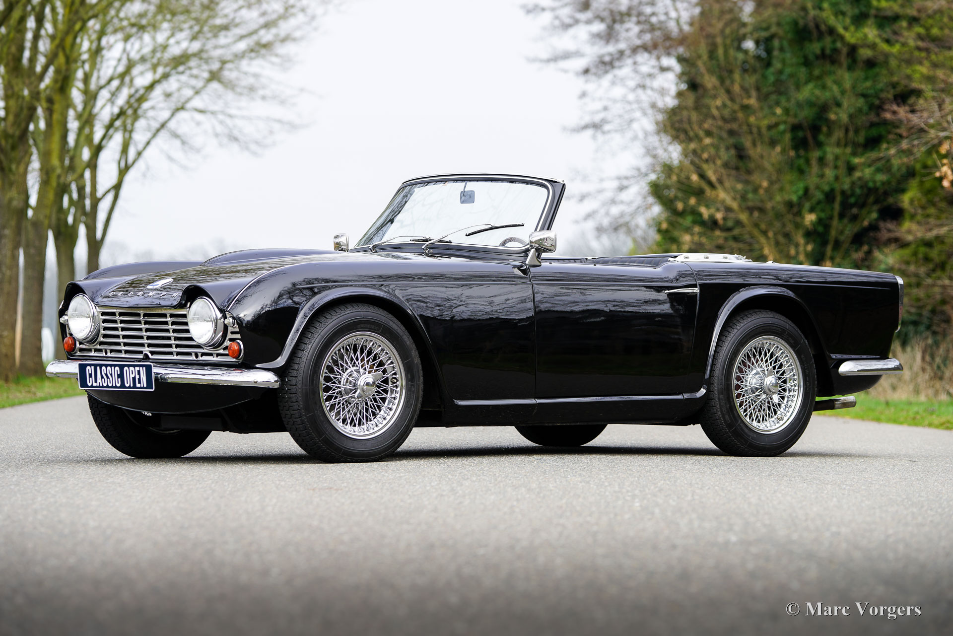 Triumph TR4, année 1965. Numéro de châssis CT38605LO. Cette magnifique Triumph TR4 arbore une élégante livrée noire, avec une carrosserie noire, un intérieur en similicuir noir et une moquette noire assortie. La voiture fut superbement repeinte, l'intérieur fut rénové et son état général est excellent. Elle se conduit avec un grand plaisir, a été régulièrement entretenue, ne présente aucune trace de corrosion et est équipée d'une batterie neuve. La TR4 possède de nombreux équipements recherchés, notamment des roues à rayons chromées, un tableau de bord en bois laqué brillant et un volant sport Moto-Lita à jante en bois (le volant d'origine est fourni). Elle est également dotée de rétroviseurs extérieurs chromés, de ceintures de sécurité à deux points, d'une radio AM Blaupunkt d'époque, de freins assistés et d'un ventilateur de refroidissement électrique. La voiture est fournie avec une capote blanche (en état correct), un hard-top blanc adaptable et un couvre-tonneau noir. La Triumph TR4 est l'un des roadsters britanniques les plus recherchés de son époque. Dessinée par le maître designer italien Giovanni Michelotti, elle alliait une esthétique distinctive à une mécanique robuste. Son moteur quatre cylindres à longue course de 2,1 litres développait 105 ch, offrant à la TR4 des performances remarquables pour sa catégorie. Ce modèle a connu un succès considérable dans les compétitions américaines de voitures de tourisme des années 1960, remportant notamment le championnat national SCCA C-Production en 1965. Il a également participé à d'importants rallyes européens tels que le Rallye des Tulipes 1962/63, le Rallye des Alpes 1962/63, le Marathon Liège-Sofia-Liège 1962/63 et le Rallye RAC 1962/63. Posséder et conduire cette Triumph TR4, c'est entrer dans l'histoire de la marque et devenir un gardien de son patrimoine. Elle offre un plaisir partagé avec d'autres passionnés et une expérience de conduite à ciel ouvert difficile à égaler.