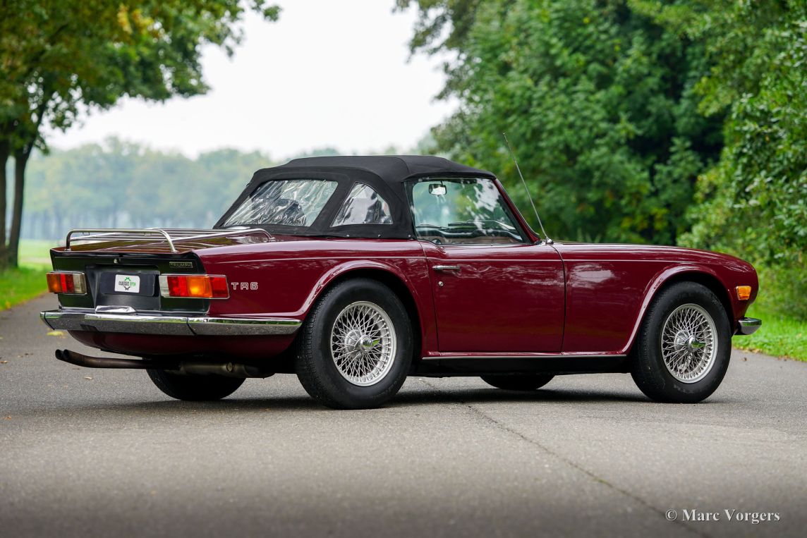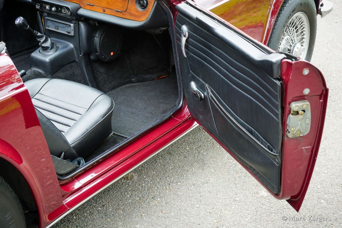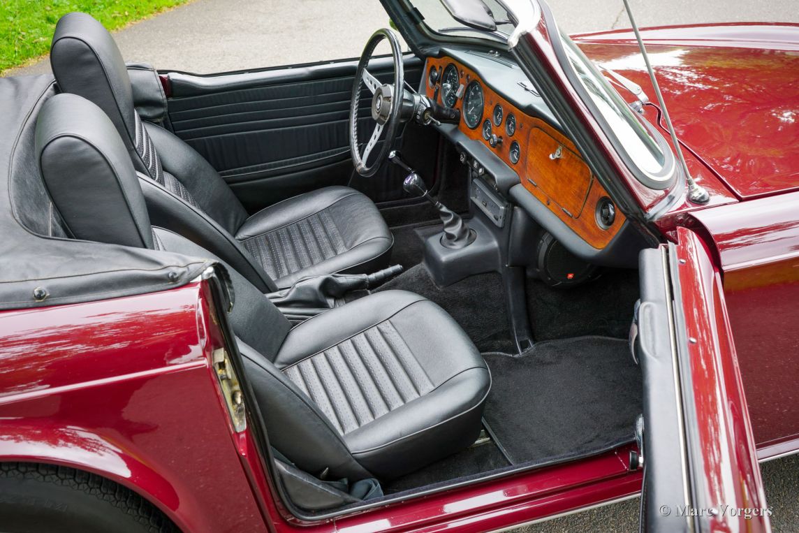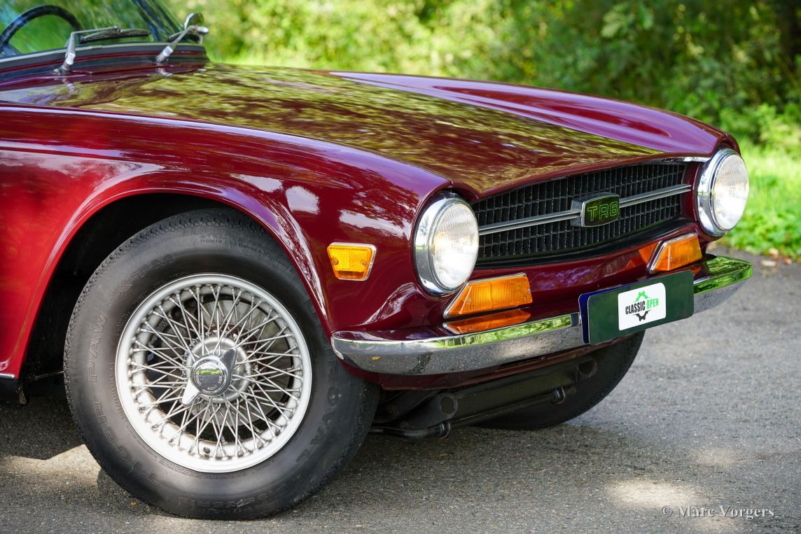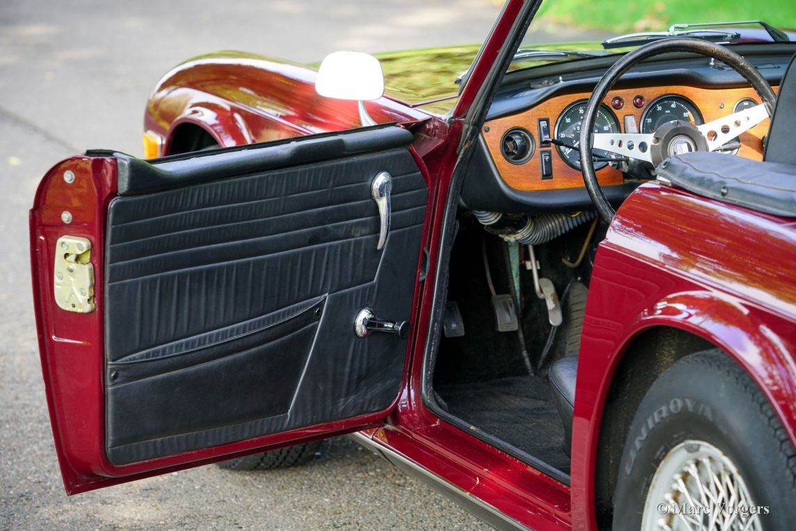 Triumph TR6, année 1969. Carrosserie rouge foncé (Damson) associée à un intérieur en similicuir noir et une capote en mohair noir. Cette magnifique Triumph TR6 fut vendue neuve aux États-Unis et importée aux Pays-Bas en 1999. Depuis, elle n'a connu qu'un seul propriétaire attentionné. Cette Triumph TR6 est une version de première génération, rarement vue, qui arbore encore des détails uniques comme les sièges auto avec appuie-têtes hauts et le volant unique à trois branches percées de trous. Les appuie-têtes sont rabattables pour permettre l'installation d'un couvre-tonneau. La voiture fut entièrement repeinte et a bénéficié d'une nouvelle sellerie et moquette. Des carburateurs SU furent installés, un allumage électronique et des filtres à air sport. La suspension fut équipée de silentblocs en polyuréthane « spécification route ». Cette magnifique TR6 de première génération conserve tous ses détails d'origine, sa conduite et sa sonorité sont excellentes et elle est en très bon état ! À notre avis, les voitures issues de longues années de conduite active et attentionnée sont les plus agréables à conduire. Ce magnifique exemplaire est équipé de l'option overdrive tant convoitée, de jantes à rayons argent métallisé avec écrous de roue chromés et d'un porte-bagages chromé. Il est également accompagné d'un certificat British Motor Heritage. La Triumph TR6 est la voiture de sport britannique offrant le meilleur rapport qualité-prix. Pratique et confortable, elle est idéale pour les road trips du week-end et les escapades en Europe !