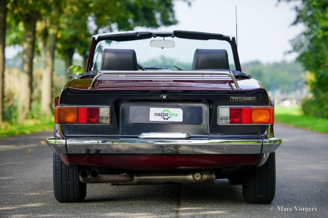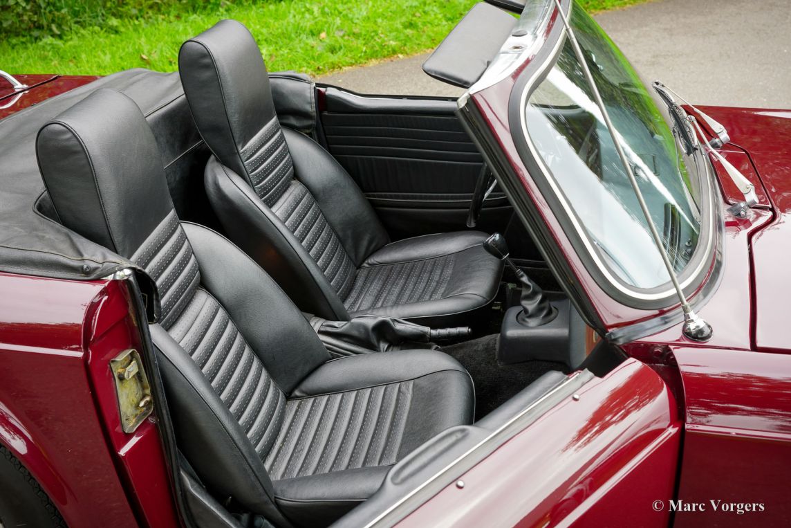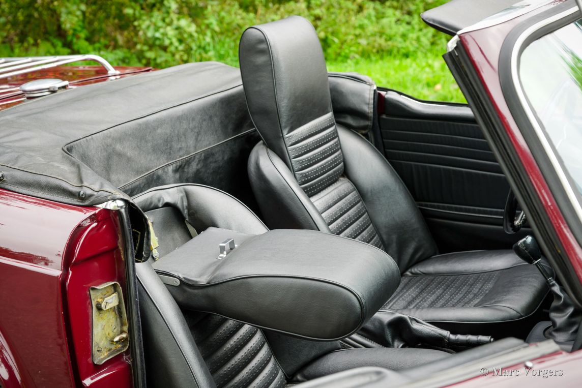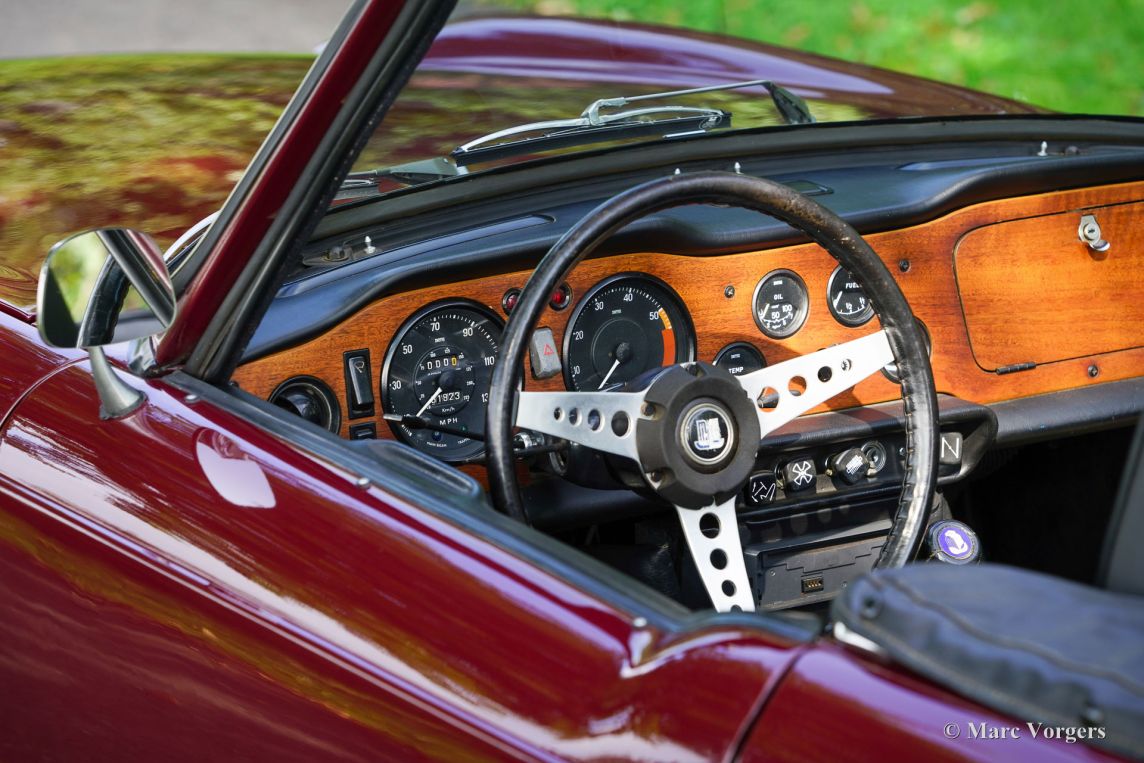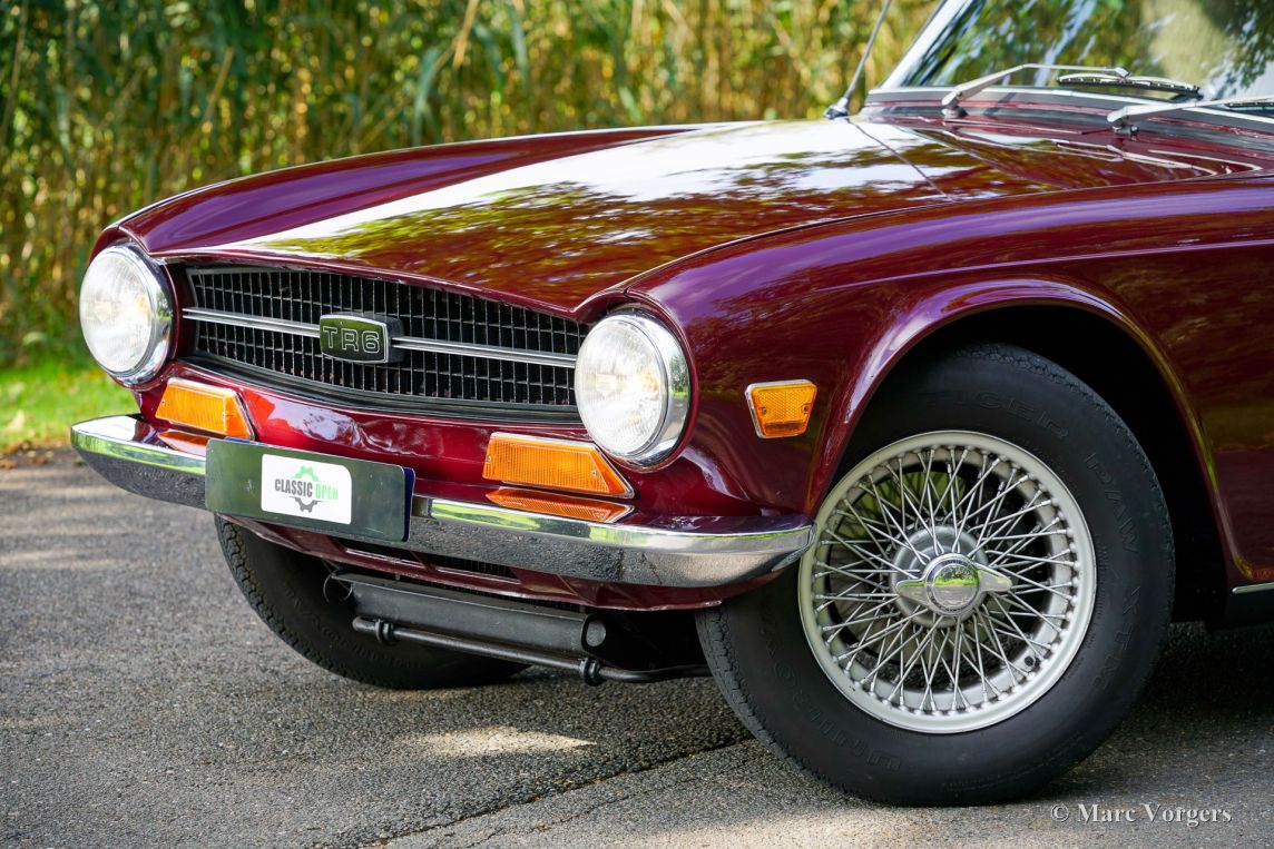 Triumph TR6, année 1969. Carrosserie rouge foncé (Damson) associée à un intérieur en similicuir noir et une capote en mohair noir. Cette magnifique Triumph TR6 fut vendue neuve aux États-Unis et importée aux Pays-Bas en 1999. Depuis, elle n'a connu qu'un seul propriétaire attentionné. Cette Triumph TR6 est une version de première génération, rarement vue, qui arbore encore des détails uniques comme les sièges auto avec appuie-têtes hauts et le volant unique à trois branches percées de trous. Les appuie-têtes sont rabattables pour permettre l'installation d'un couvre-tonneau. La voiture fut entièrement repeinte et a bénéficié d'une nouvelle sellerie et moquette. Des carburateurs SU furent installés, un allumage électronique et des filtres à air sport. La suspension fut équipée de silentblocs en polyuréthane « spécification route ». Cette magnifique TR6 de première génération conserve tous ses détails d'origine, sa conduite et sa sonorité sont excellentes et elle est en très bon état ! À notre avis, les voitures issues de longues années de conduite active et attentionnée sont les plus agréables à conduire. Ce magnifique exemplaire est équipé de l'option overdrive tant convoitée, de jantes à rayons argent métallisé avec écrous de roue chromés et d'un porte-bagages chromé. Il est également accompagné d'un certificat British Motor Heritage. La Triumph TR6 est la voiture de sport britannique offrant le meilleur rapport qualité-prix. Pratique et confortable, elle est idéale pour les road trips du week-end et les escapades en Europe !