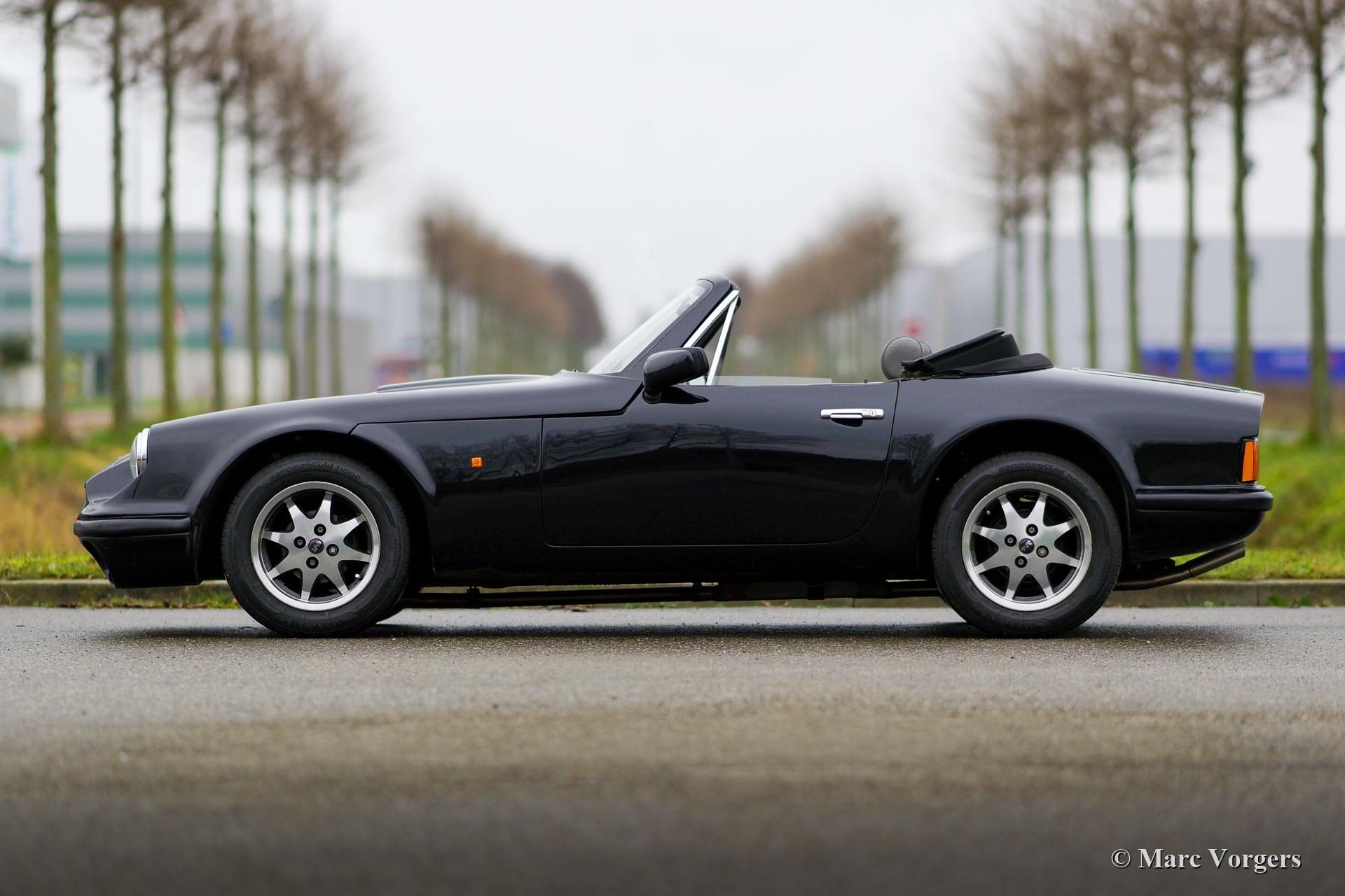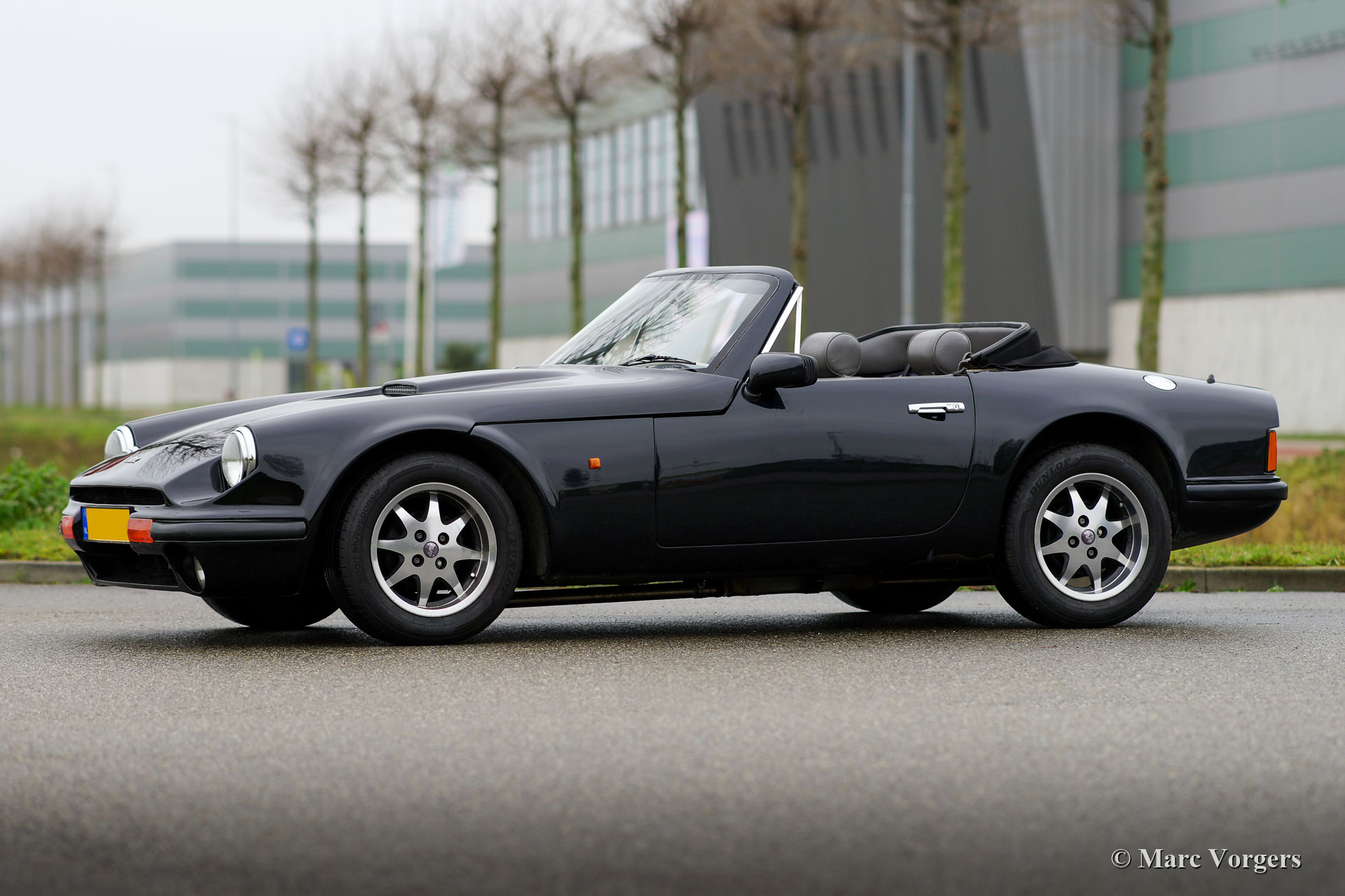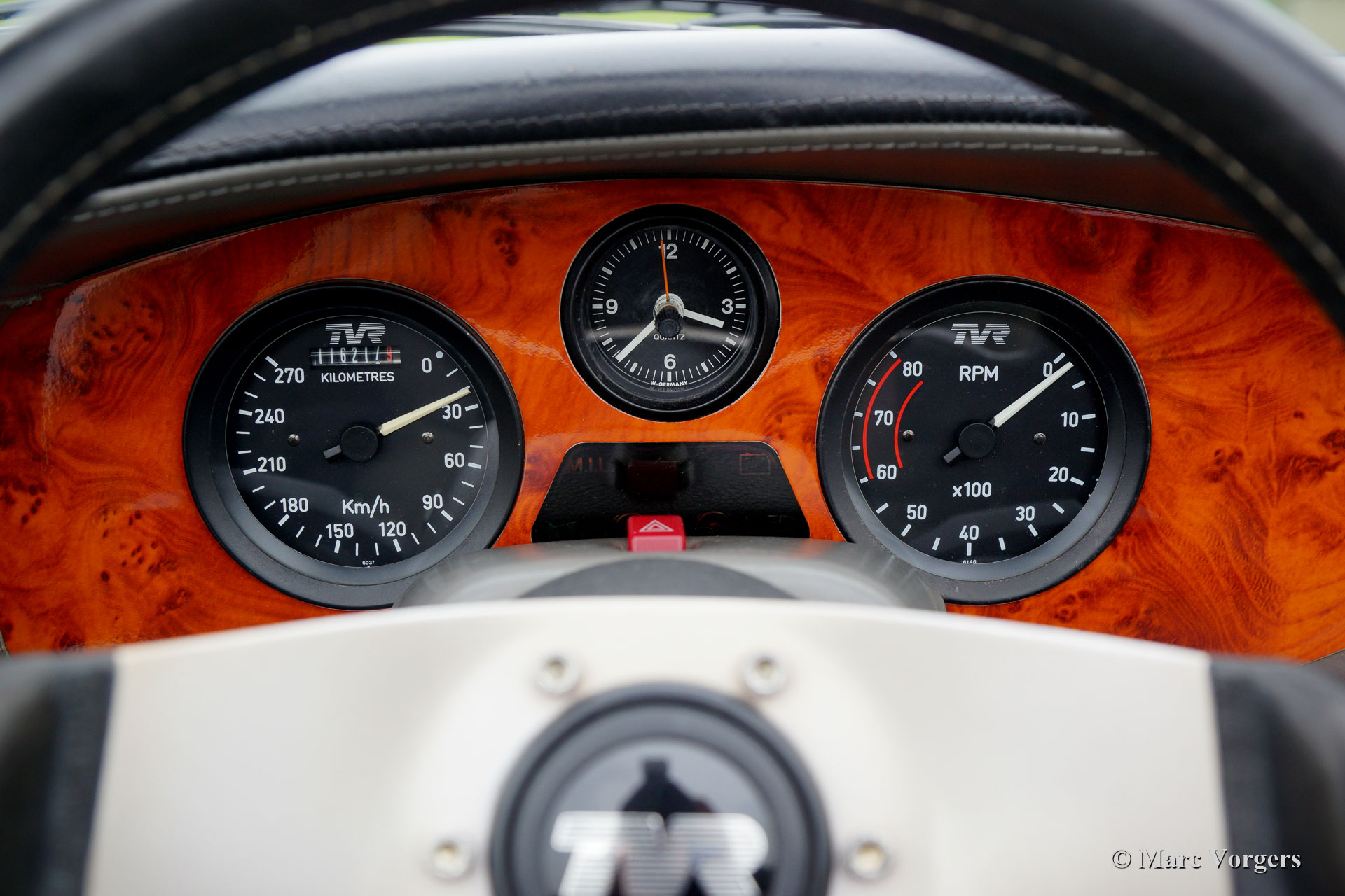 TVR S3, année 1991. Couleur noir combinée avec un intérieur en cuir gris et un toit « Targa » noir. Le TVR S3 est équipé du moteur Ford V6 de 2,9 litres qui délivre une puissance de 170 ch. La puissance est transmise aux roues arrière via une boîte de vitesses manuelle à 5 vitesses. Le son du moteur est grisant et addictif ! Seuls 112 exemplaires de ce modèle ont été construits de 1989 à 1993. La TVR a parcouru 116 000 kilomètres depuis la nouvelle et la voiture est en très bon état. Une caractéristique spéciale du TVR est le toit « Targa » avec la partie arrière rabattable. Le panneau de toit peut être rangé dans le coffre. Les voitures TVR sont entièrement fabriquées à la main et l'intérieur entièrement en cuir offre un grand espace. L'expérience de conduite à toit ouvert est superbe !