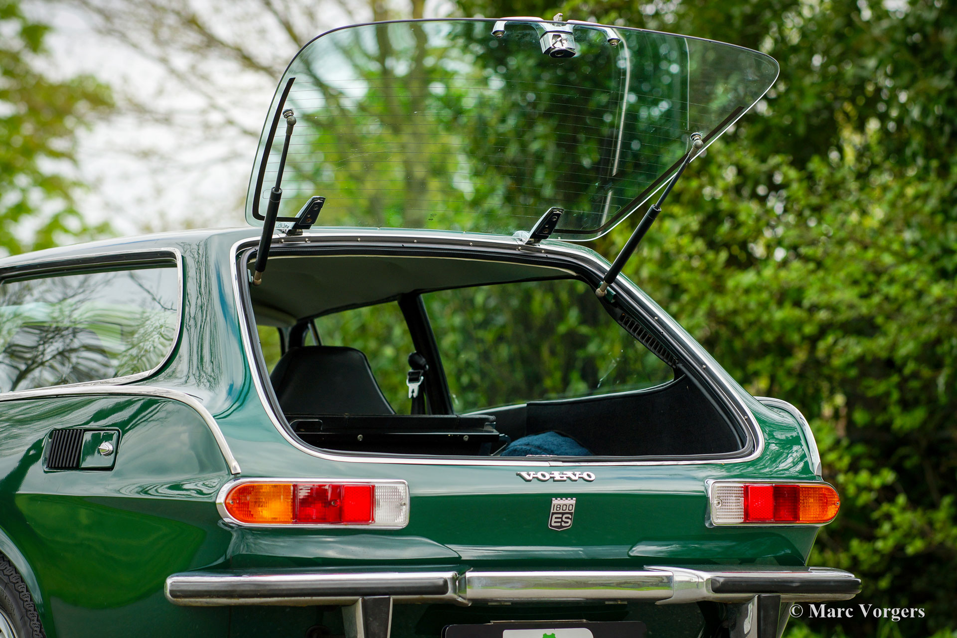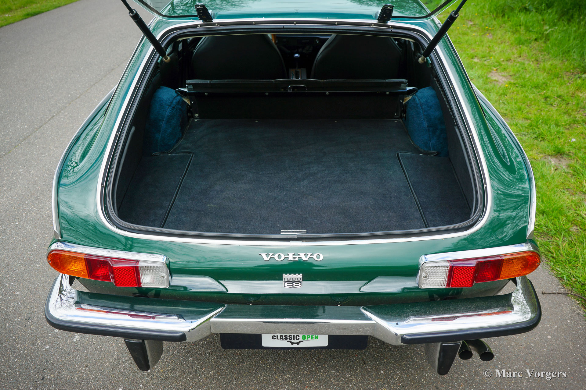 Volvo 1800 ES automatique, année 1972. Couleur vert foncé combinée avec un intérieur en cuir noir et un tapis noir. Cette magnifique et accrocheuse Volvo 1800 ES a été vendue neuve aux États-Unis. La Volvo 1800 ES est l'un des premiers « lifestyle estates », un autre exemple classique est le Reliant Scimitar. L'automobile fut importée des États-Unis aux Pays-Bas en 2006. Après son arrivée aux Pays-Bas, la voiture fut restaurée détaillée. Le tableau de bord d'origine et la sellerie cuir furent refaits à bonne condition. Un reportage photo de la restauration est présent, et le dossier historique contient les factures de restauration. Depuis 2006, cette désirable Volvo 1800 Es n'a connu qu'un seul propriétaire. La 1800 ES est équipée du célèbre moteur quatre cylindres Volvo B20 équipé d'un système d'injection d'essence. Ces dernières années, un échappement en acier inoxydable fut installé et un allumage électronique 123. Le moteur tourne parfaitement et la boîte de vitesses automatique à 3 rapports fonctionne très bien. La Volvo 1800 ES est une voiture merveilleusement conçue avec des détails fantastiques comme les longues vitres latérales, le couvercle de coffre en verre et la garniture latérale chromée s'étendant dans les poignées de porte. La Volvo 1800 ES est une voiture classique assez rare, seuls 8078 exemplaires furent produits de 1971 à 1973. Cette Volvo 1800 ES roule et pilote très bien. Une icône des années 1970 pour les passionnés de Volvo !